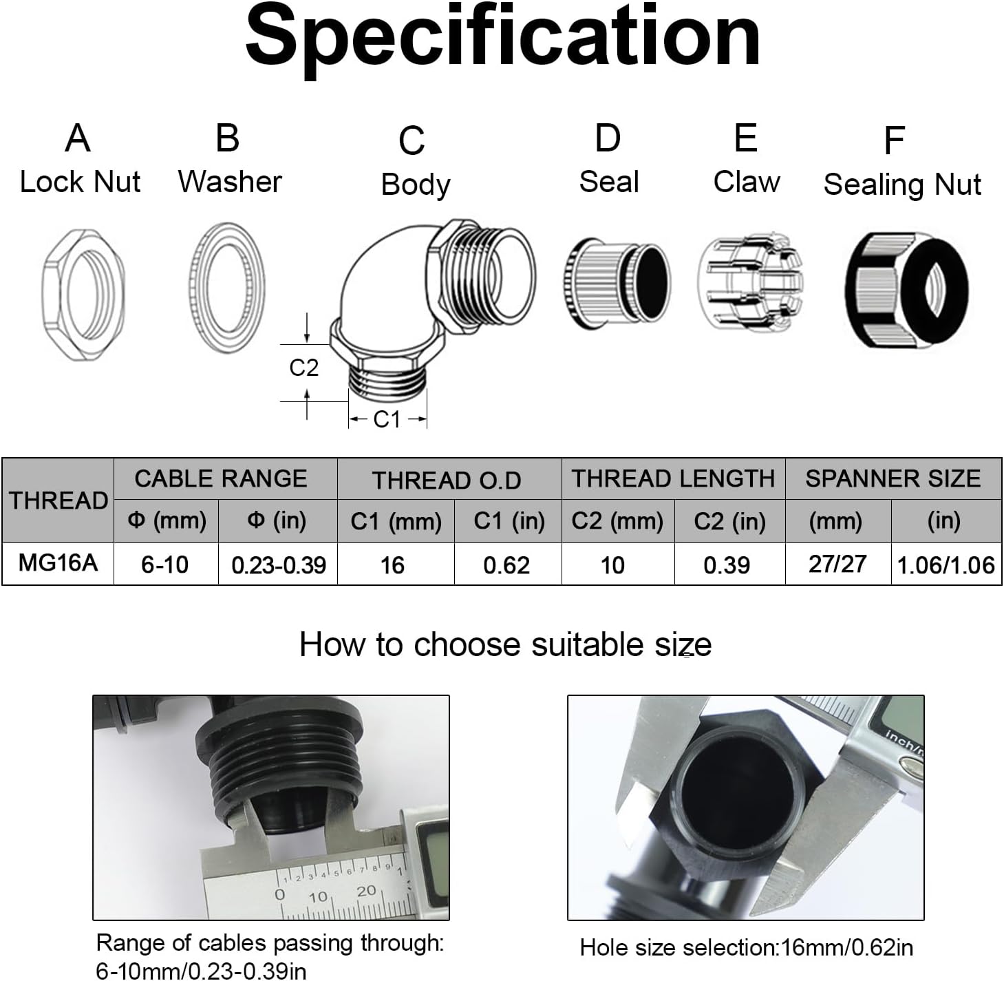 - Cable Range: M16 cable connectors has cable range 0.23in-0.39in (6-10mm) and specific data for cable and hole-drilling please refer picture of specification.
