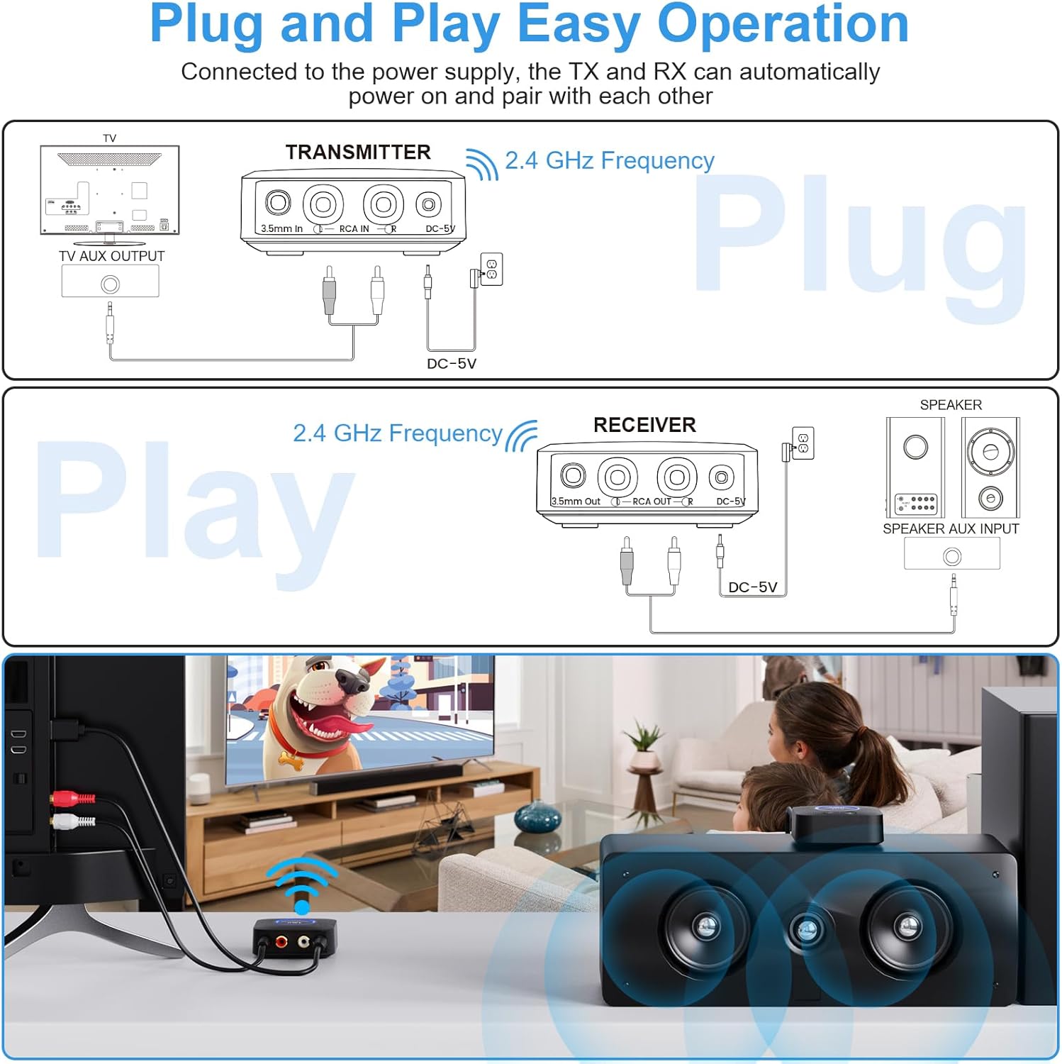 - 【Dual AUX/RCA In/Out】Comes with 3.5mm plug to RCA adapter cable, the audio receiver support simoutaneous AUX/ RCA output for 2 speakers. Connect the transmitter with PC, TV, CD, MP4 output, and connect the receiver with powered speaker, amplifier or home theater, plug and play, easy operation for true wireless audio transmission. Dual AUX and RCA input at the same time is not recommended, as the audio would be mixed up at the receiving end.