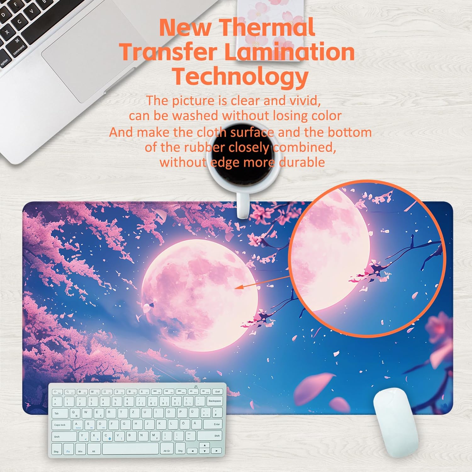 Large Gaming Mouse Pad for Desk, Falling Cherry Blossoms Desk Mat, Bright Full Moon Desk Pad, 31.5"x15.7" Extended Big Computer Keyboard Mouse Pad with Non-Slip Base and Stitched Edge