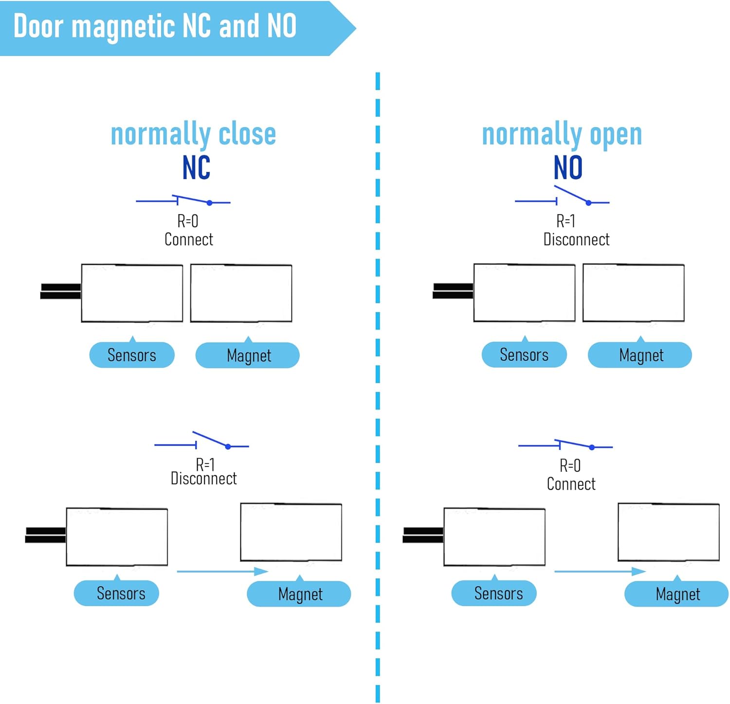 - 【Normally Closed (NC)】Normally closed type with 2 wires. When the magnet together, the circuit is conductive( light on ); the circuit is not conductive ( light off ) if the magnet separates.