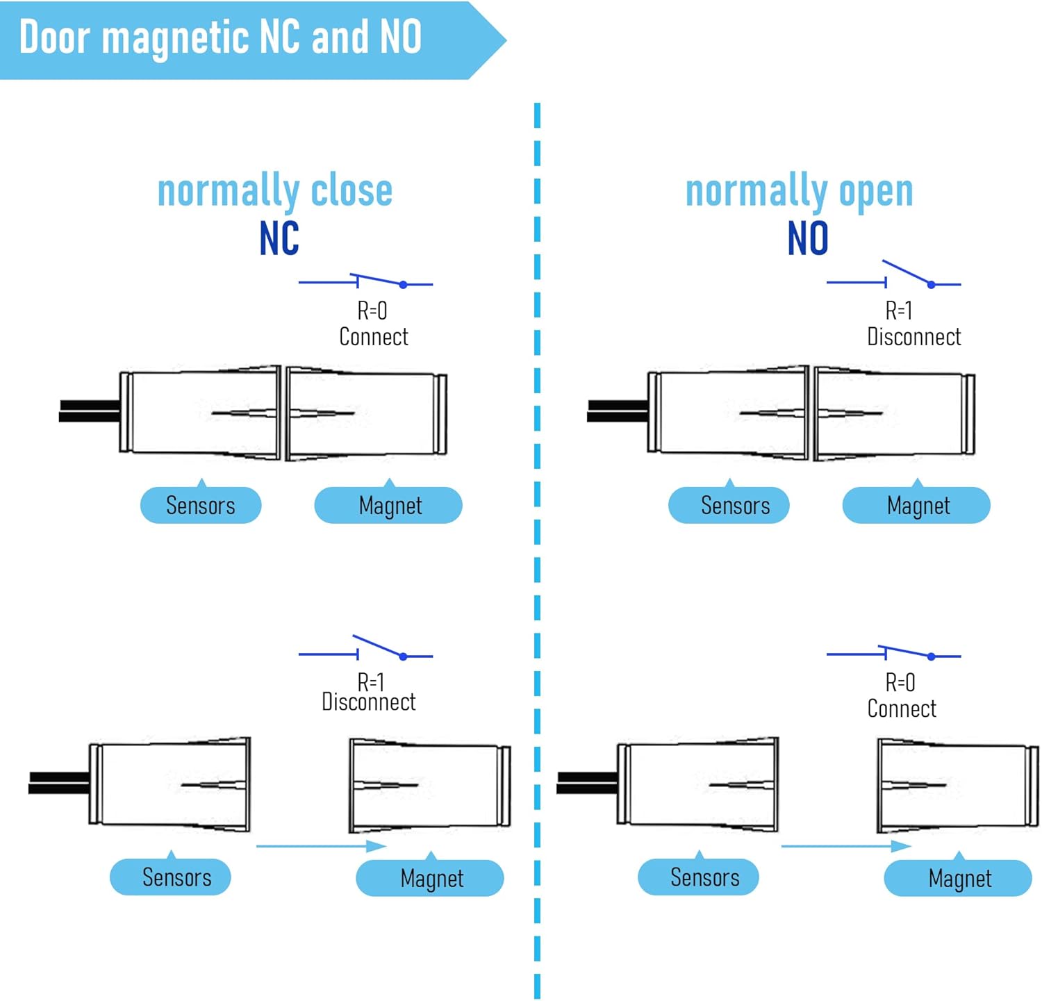 - 【Normally Closed (NC)】Normally closed type with 2 wires. When the magnet together, the circuit is conductive( light on ); the circuit is not conductive ( light off ) if the magnet separates.