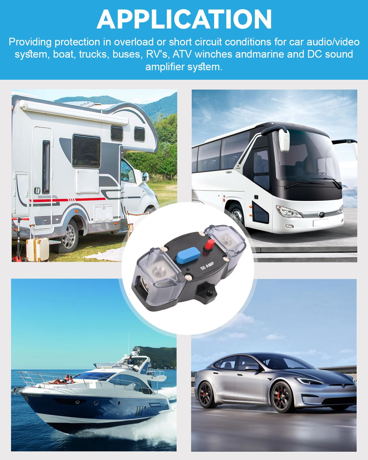 - APPLICATIONS: Ideal for protecting against overloads and short circuits in high-current applications such as cars, boats, RVs, caravans, tractors, audio systems, horns, dual-battery isolators, and winches. This high amp 150a 12v breaker fuse is perfect for use in automotive, marine, and auxiliary DC electrical systems, providing a versatile solution for Automotive Circuit Breaker and Marine Circuit Breaker needs