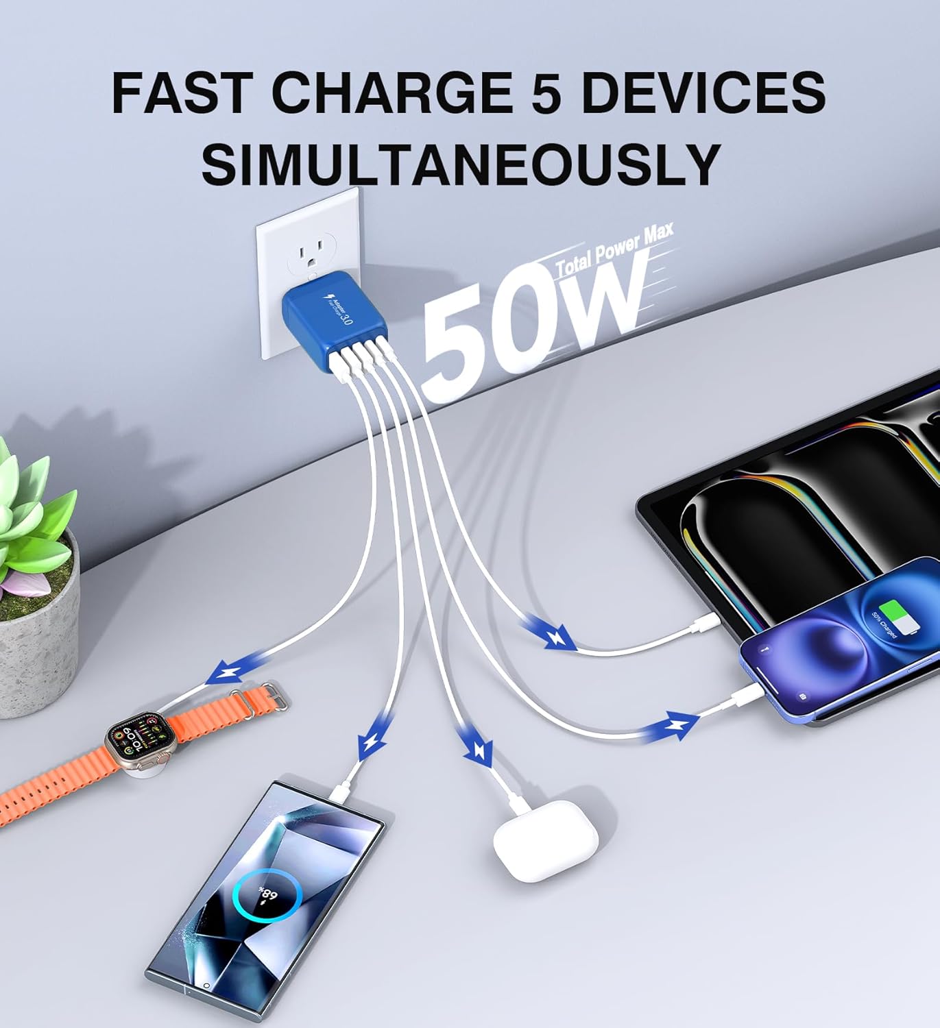 (2-Pack) 50W USB C Wall Charger Block, 5-Port C Charger Fast Charging Block PD Power Adapter +QC 3.0 Multiport Type C Box Brick Cube USB A Wall Plug for iPhone 16/15/14 Pro Max,Samsung (Dark Blue)