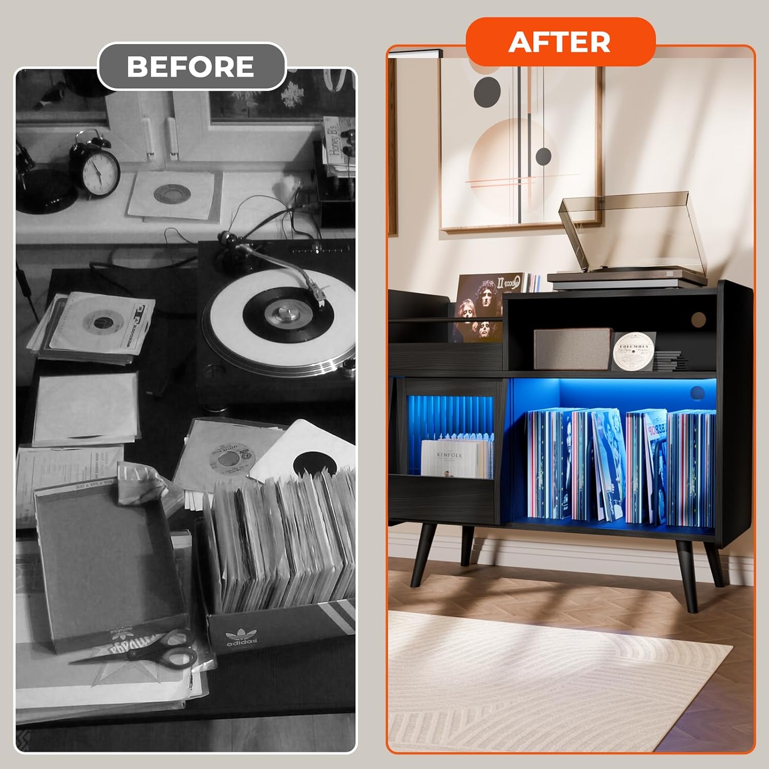 - 【Sliding Door for Extra Storage】 Our record player cabinet feature sliding doors with smooth rails, offering customers the option of increased privacy without the clutter. The sliding door design also includes extra storage space, ideal for storing your preferred records or books in a convenient and accessible manner.