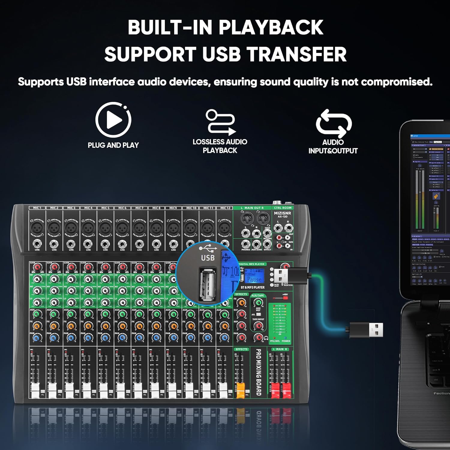12 Channel Audio Mixer, Professional DJ Mixer Board Sound Music Mixing Console Digital Mixer with Reverb, Bluetooth, USB Port, 48V Phantom Power for Recording Karaoke Podcasting