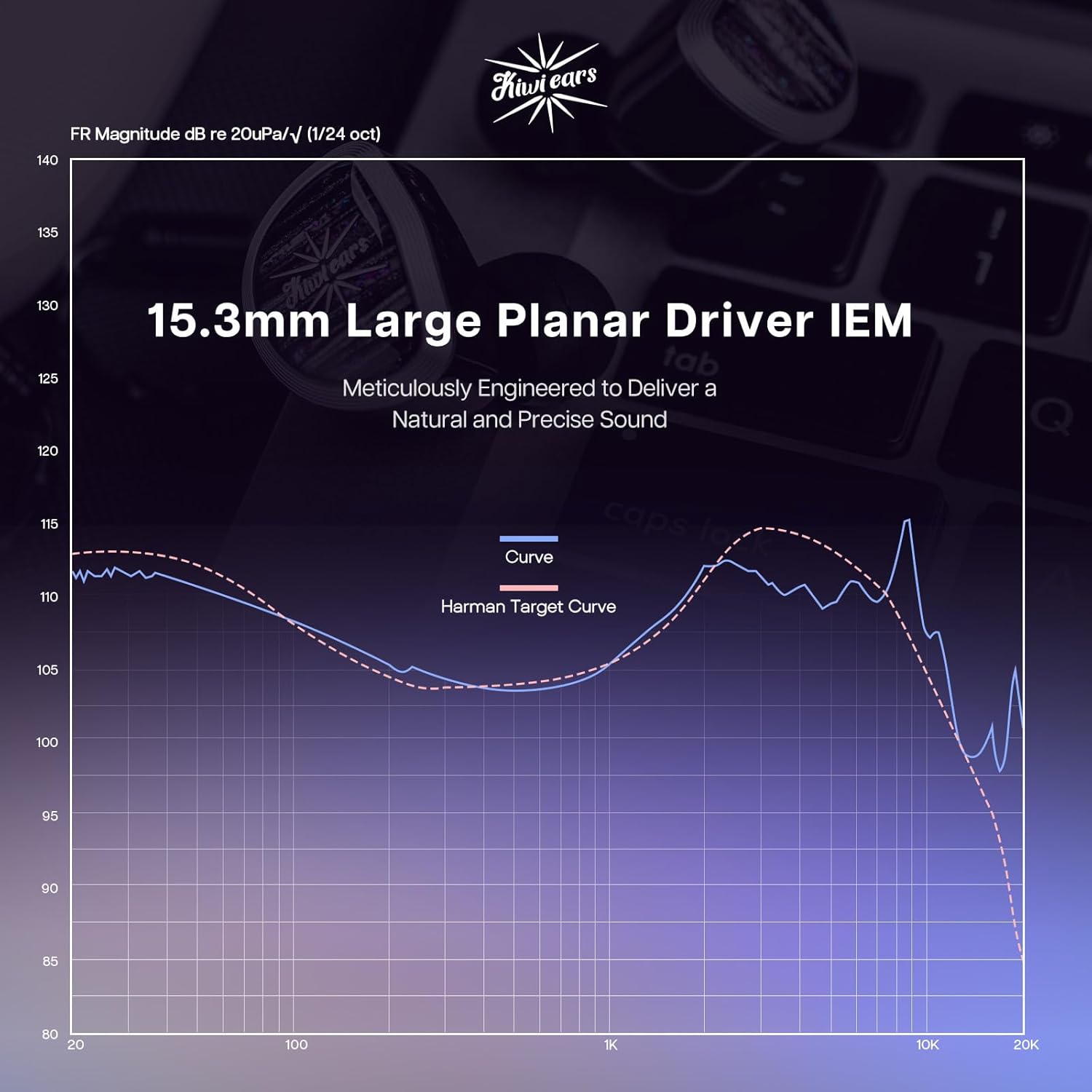 - ๐๐จ๐ง๐๐ฅ ๐๐ง๐ญ๐๐ ๐ซ๐ข๐ญ๐ฒ:Tonal integrity was a key feature in engineering the Aether. Staying true to Kiwi Earsโ signature tonal balance, the Aether has been meticulously engineered to deliver a natural and precise sound. The bass is focused with sub-woofer-like slam and a mild mid-bass to mids transition to give a slight warmth to the body of the sound. The core midrange from 300 to 800Hz is flat to give a monitor-like accuracy to instruments and vocals. The treble was painstakingly tuned to carefully match the tonal perception of the human ear and give a clear, yet natural upper frequency response.