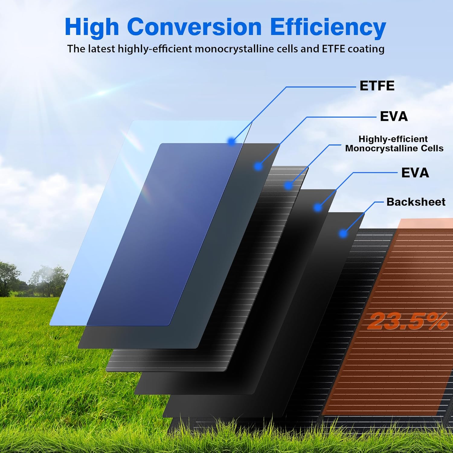 - High Solar Conversion Efficiency Up To 24%!!! This portable solar panel uses the latest highly-efficient monocrystalline solar cells that convert the sunlight efficiently into clean energy with high conversion efficiency of up to 24%!