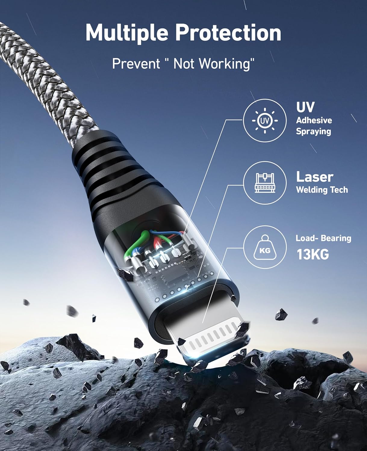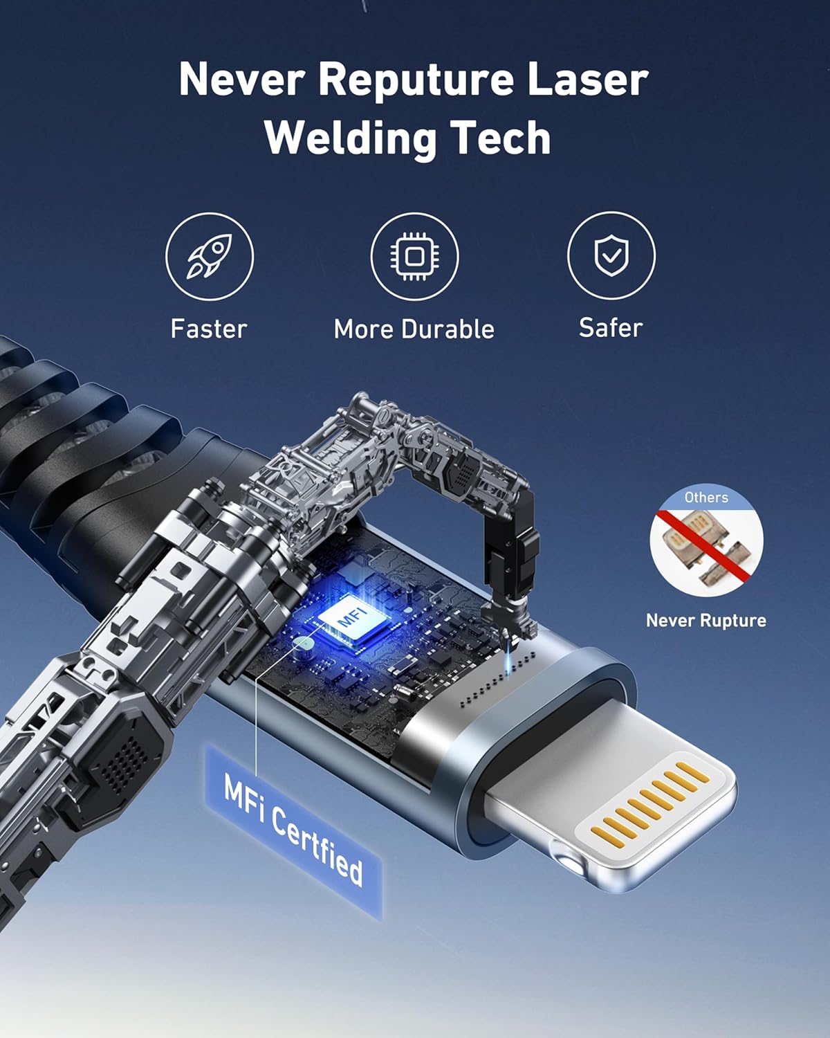 - Triple Protection iPhone Charging Cable: MFi certified iPhone charger cable built-in an Apple smart chip to ensure 100% compatibility with all iPhone and iOS devices with lightning port; it built-in laser welding technology, which ensure the metal part won't break. The copper core part is reinforced with UV glue to prevent the solder joints from falling off