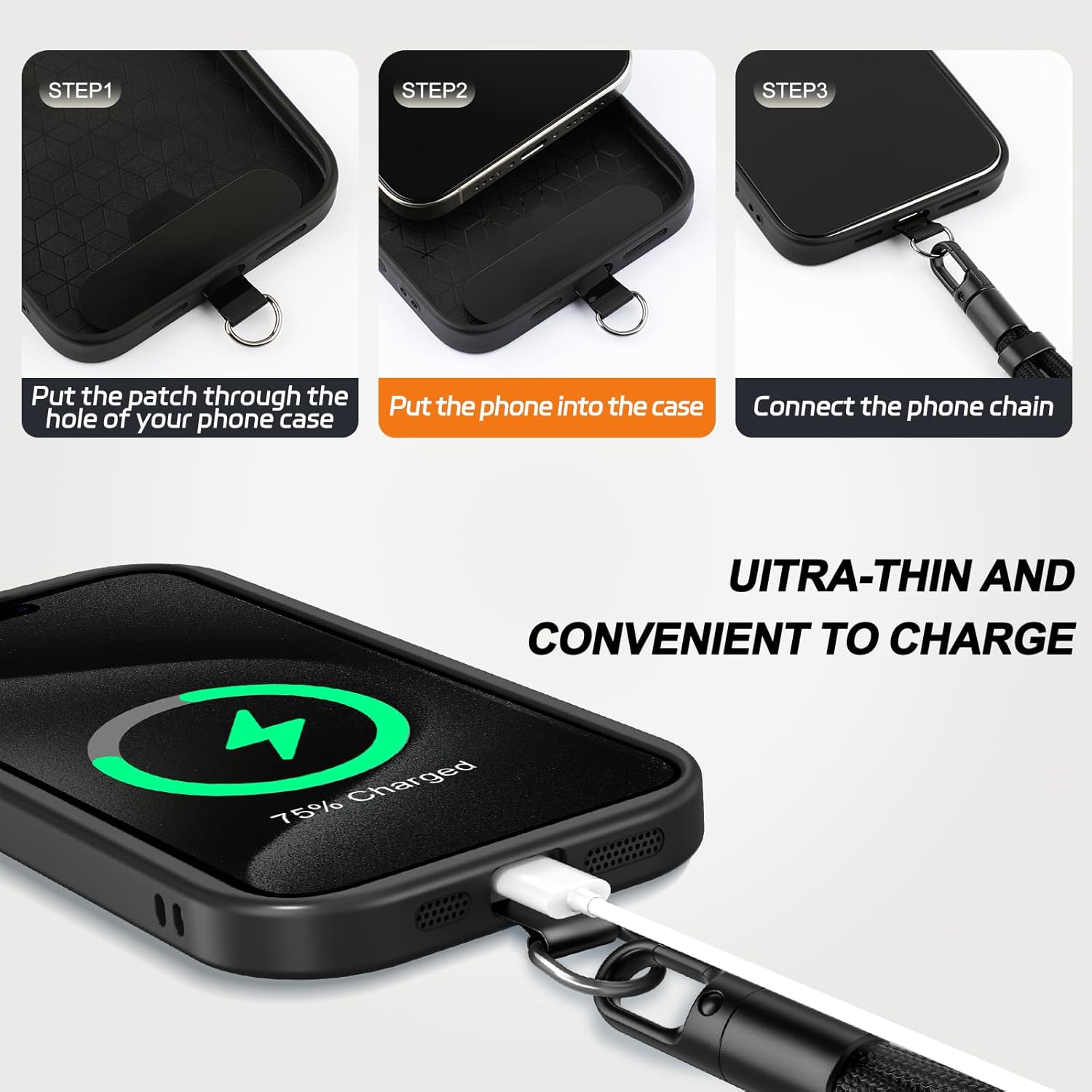 - 【Not Blockcharging Port】: The phone tether tab is very thin and light and the universal cell phone chain does not block your charging hole,Compatible for both corded and wireless charging without being removed.