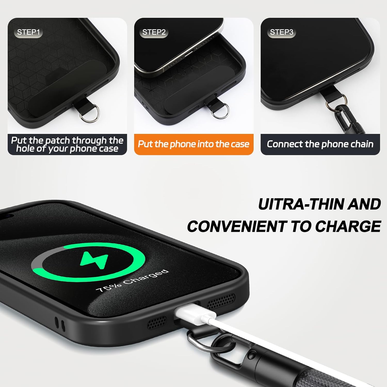 - 【Not Blockcharging Port】: The phone tether tab is very thin and light and the universal cell phone chain does not block your charging hole,Compatible for both corded and wireless charging without being removed.