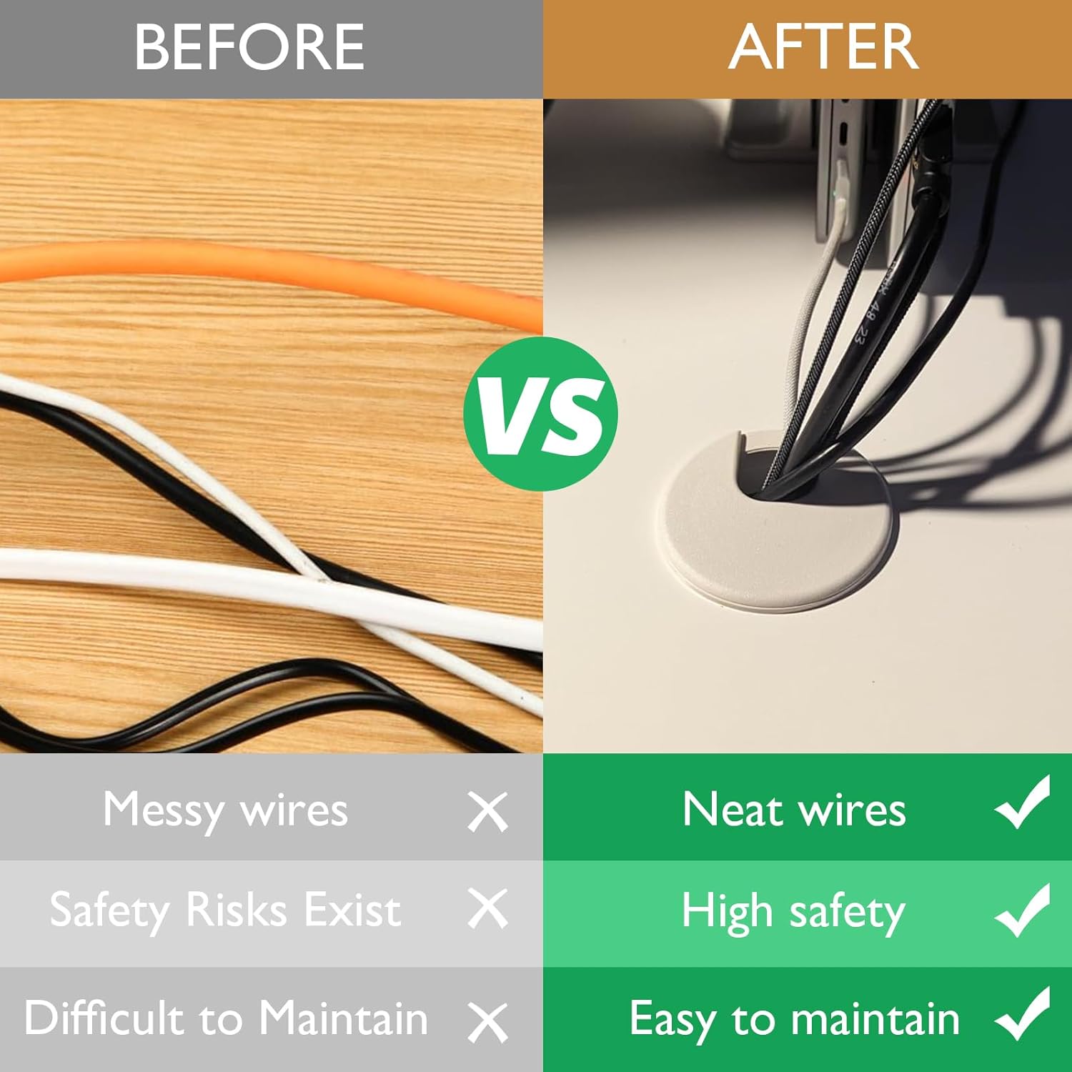 - PORTABLE STORAGE AND PROTECTION:The cord grommet can help to organize the cables on the desktop, which can keep the desktop tidy and improve the work efficiency; Reduces bending and pulling of cables, extends cable life and reduces safety hazards