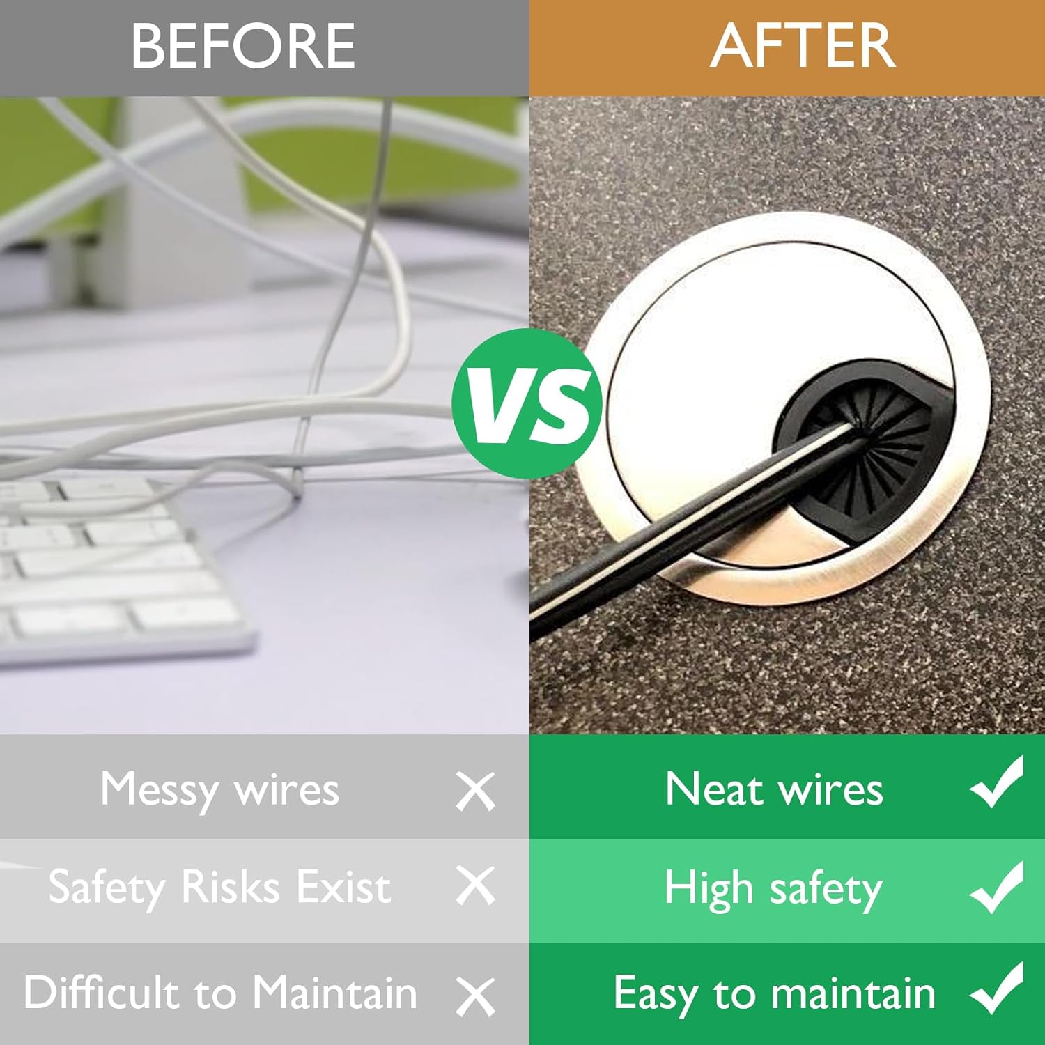 - Slip-RESISTANT AND PROTECTION:Our desk cable hole has a matching buckle to prevent the outer ring and cover from sliding; The cord grommet can help to organize the cables on the desktop, which can keep the desktop tidy and improve the work efficiency; Reduces bending and pulling of cables, extends cable life and reduces safety hazards