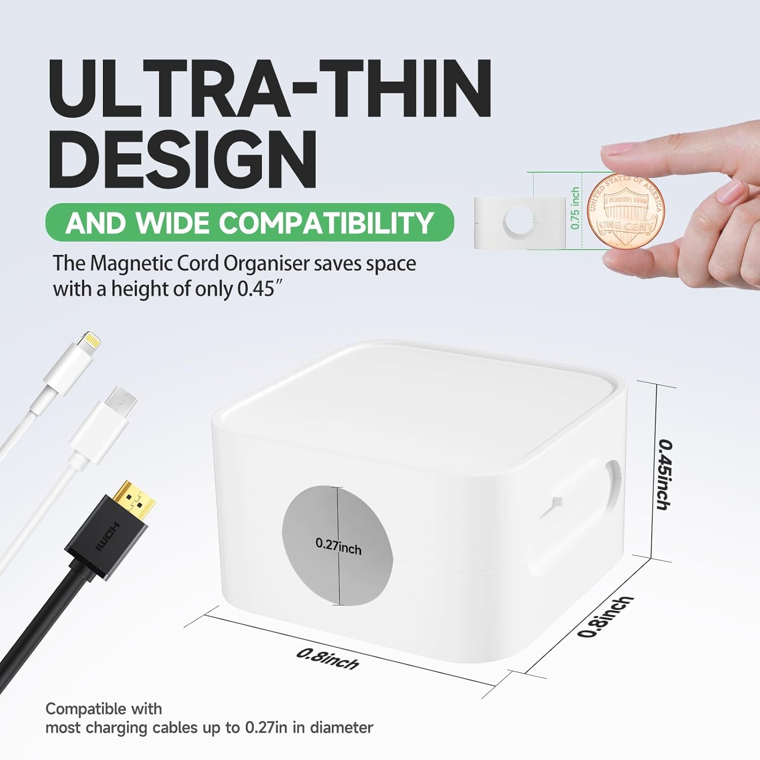 - 【Versatility】Cord management size is 0.8 ‘L x 0.8 “W x 0.45 ”H, 2025 newest slim design, can be better adapted to or hidden in the narrow space. Installed in the home or office on the desk, nightstand, wall, car,etc. Compatible with most cables up to 0.27’ OD. e.g. mobile phone USB charging cable/HDMI/computer/headphone/light strip/small appliances power cord etc.