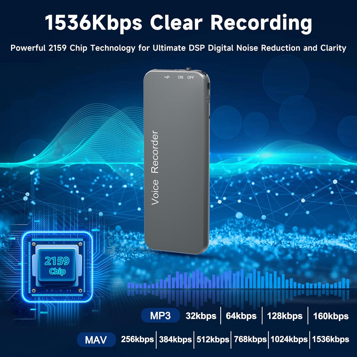 - 1536Kbps Excellent Sound Quality: Newly upgraded 2159 smart recording chip equipped with DSP intelligent noise reduction technology, records clearer sound up to 1536kbps, filtering out more background noise than other chips