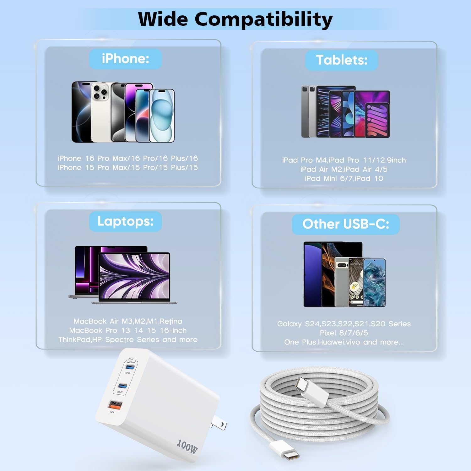 - [ Multi-Device Compatibility ] - 100W USB C Mac book Fast Charger is perfectly compatible with iPhone 16/ iPhone 16 Plus/ iPhone 16 Pro/ iPhone 16 Pro Max/iPhone 15/ iPhone 15 Plus/ iPhone 15 Pro/ iPhone 15 Pro Max, iPad Pro 12.9/11-inch, iPad Air 6/5/4, iPad Mini 7/6, iPad 10, Samsung, Google, Mac Book Pro 13/14/15/16 inch, Mac Book Air 13/12 inch,and more USB C device