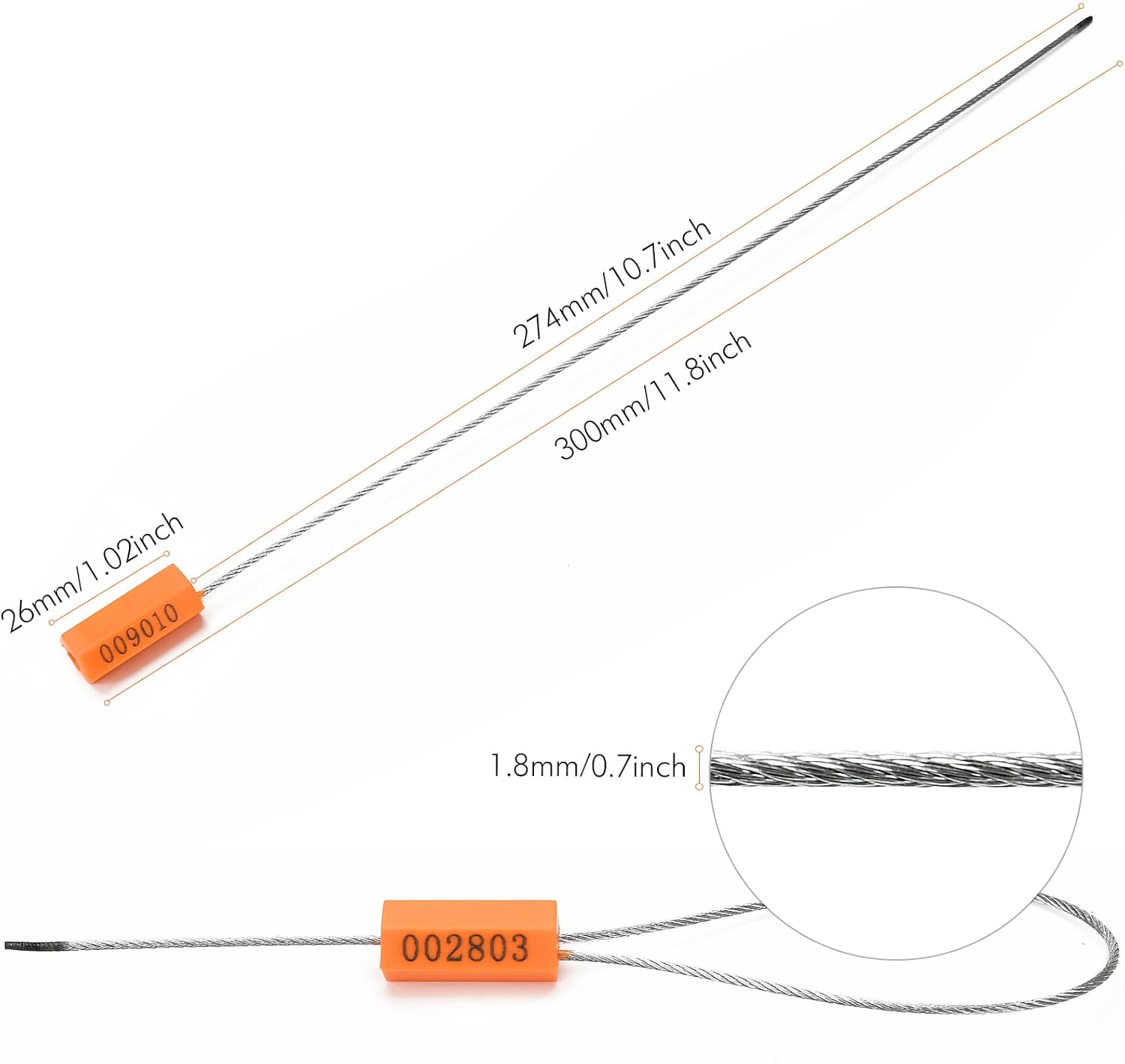 - This Security Seal material: ABS Plastic Coated, Steel Lock and zinc casting for this shipping seals, φ1.8mm (0.07") Steel Wire, Total length: 300mm (11.8")