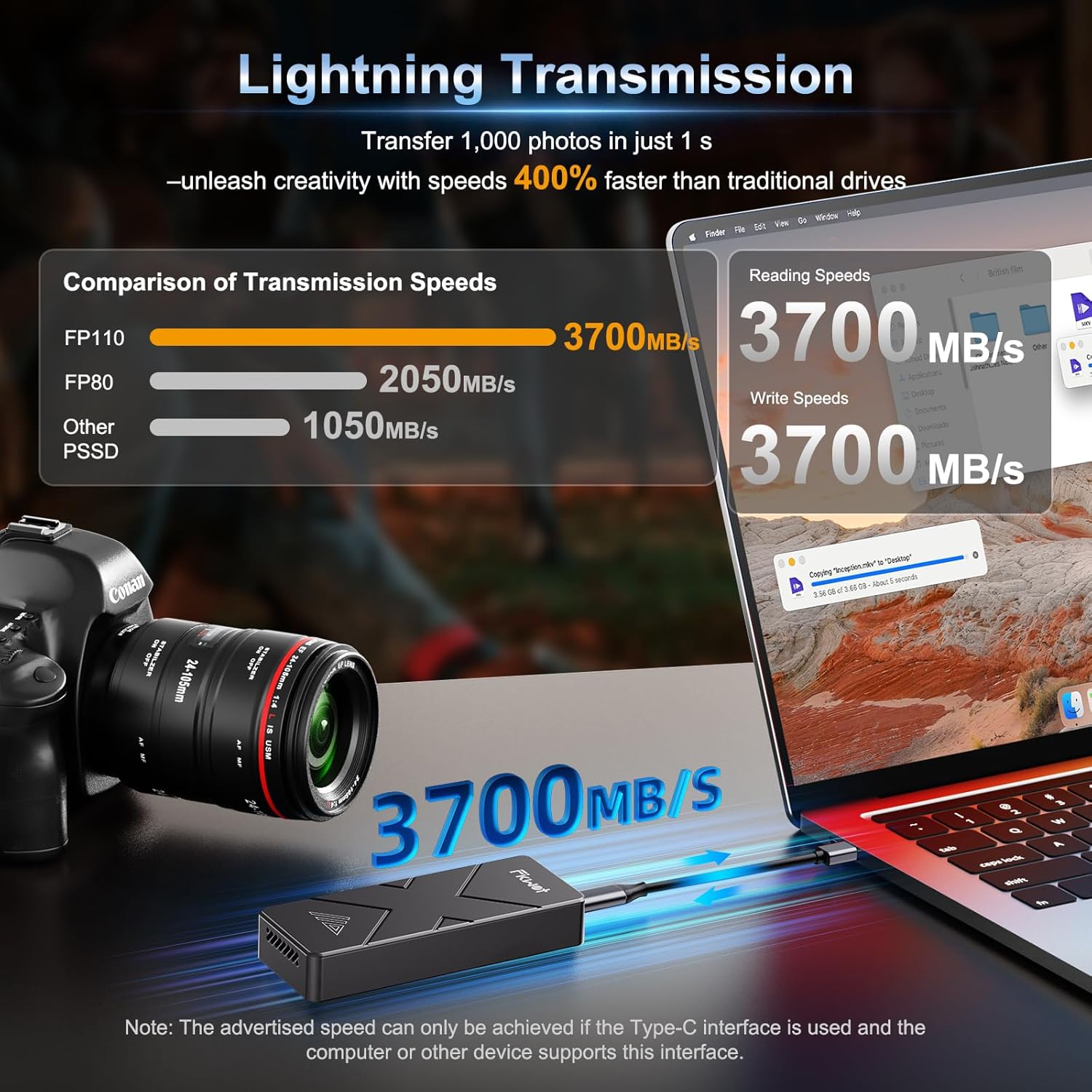 - 【Widely Compatible】FP110 Solid State External Hard Drive requires no software installation; simply plug and play. It supports both Thunderbolt 3/4 (40Gbps) and USB-C (10Gbps) dual modes, making it compatible with devices such as iMacs, MacBooks, iPads, iPhone15/16 series models, Android phones, Smart TVs, Xbox game consoles, as well as various operating systems including Windows, macOS, Linux, and Android.