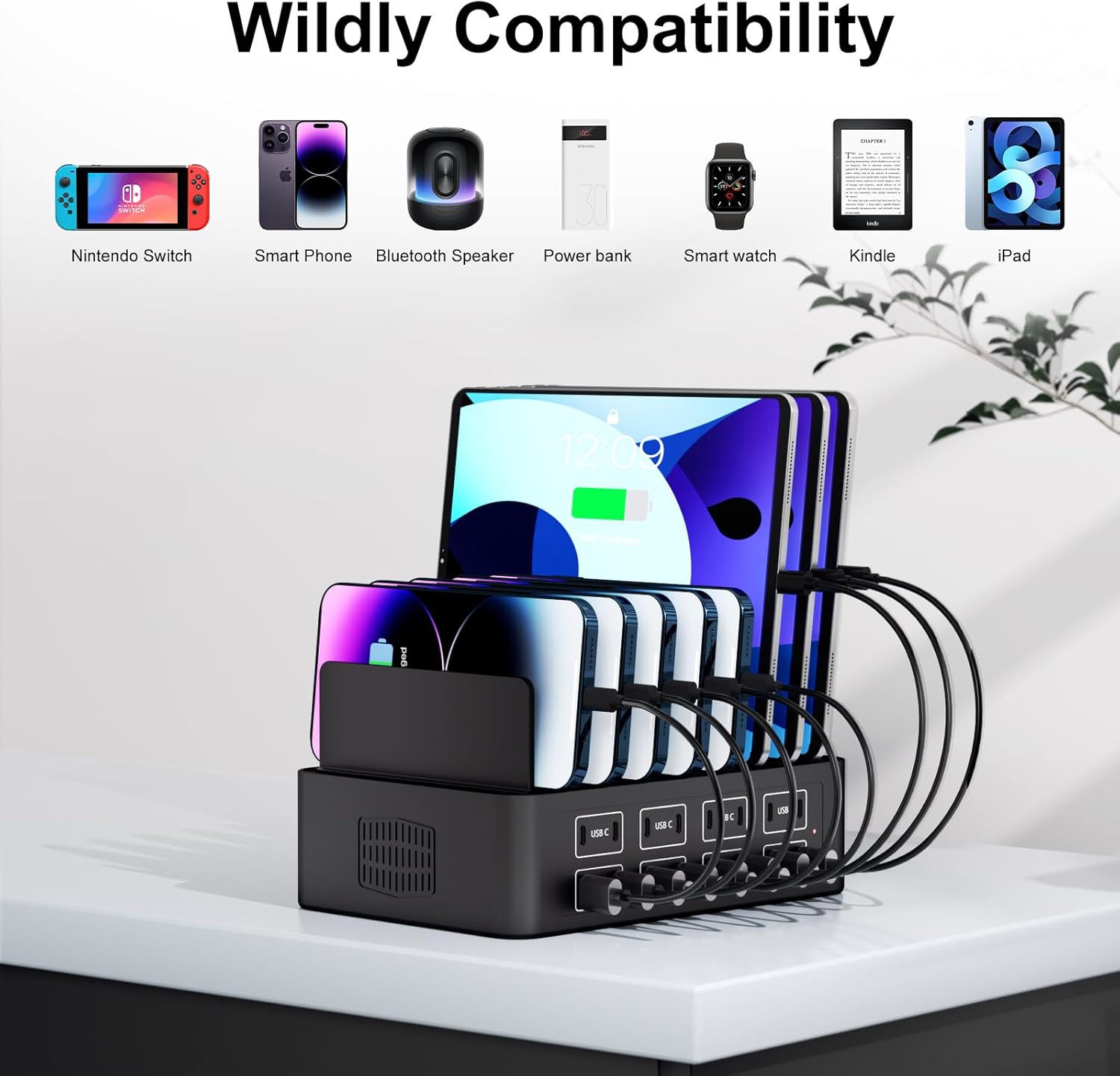 - [One Hub, All Devices] The USB C Charging Station is your universal power solution. Designed to work seamlessly with iPhone, Android phones, tablets, earbuds, Kindles, smartwatches, gaming consoles, and more, this hub eliminates the need for multiple chargers. Whether at home, in a bustling office, or on a global adventure, it powers every device in your life with unmatched versatility