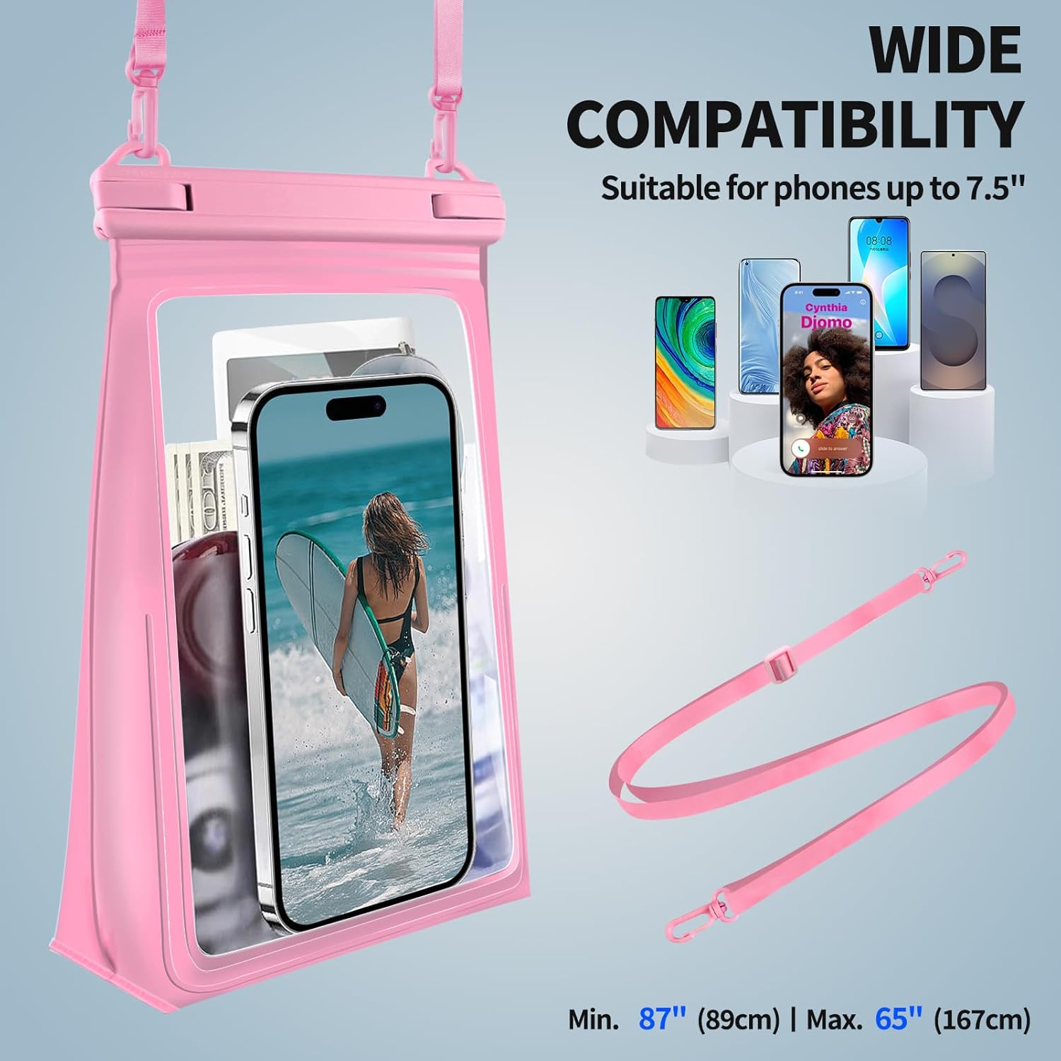 - LARGE CAPACITY SPACE & FIT MORE】The large capacity waterproof phone pouch features a bottom triangle design to expand the space, 6" wider opening, makes it easier to put in/out. With 2 pockets, main pocket for all small items such as wallet, card, sunglasses, sunscreen, lipstick, keys, powers, headphones, small fan and other valuables; front pocket for all phone sizes such as iPhone 16 15 14 13 12 11 Pro Max Plus, Galaxy S25 S24 S23 S22 S21 Ultra Google Pixel, etc