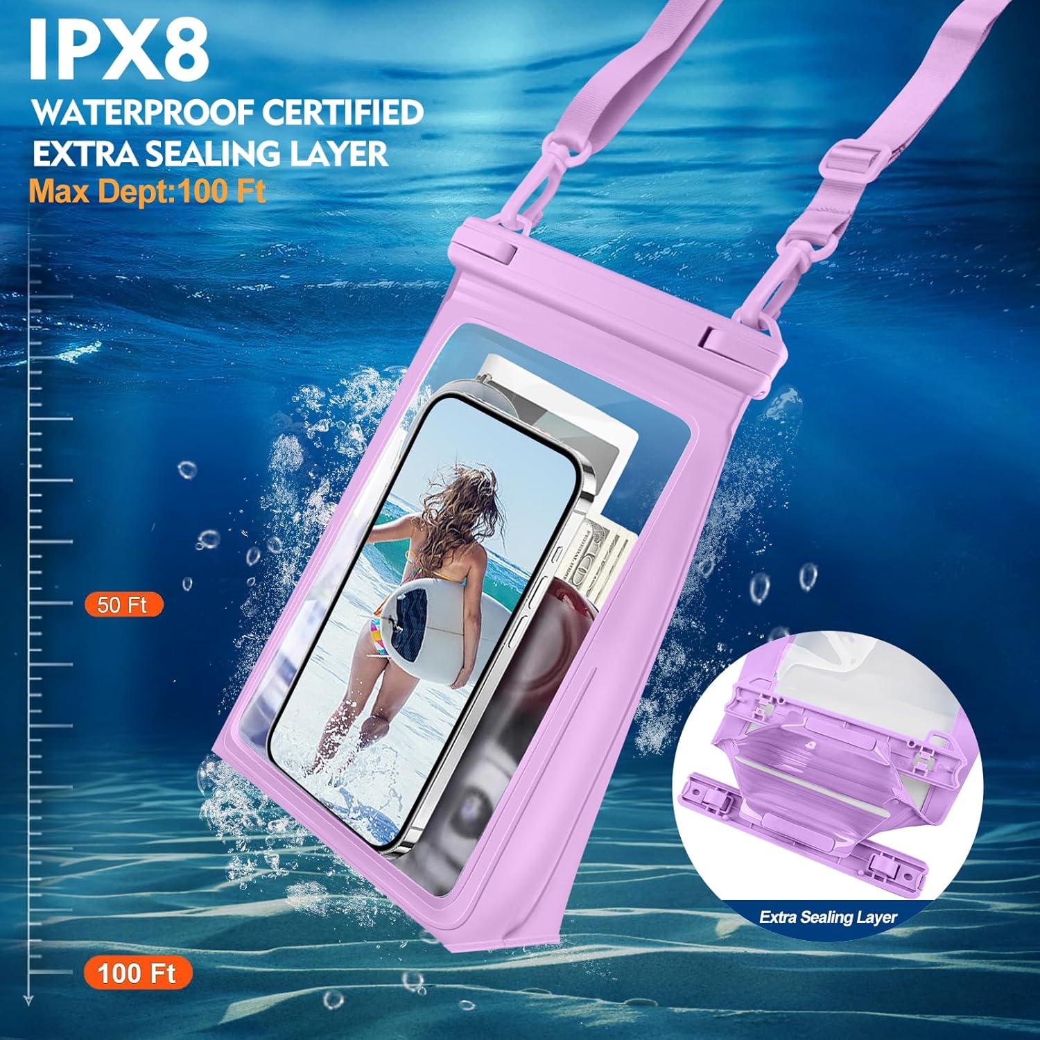 - [DOUBLE SEAL & IPX8 WATERPROOF CERTIFIED] Unlike other waterproof bags- Use ABS material waterproof sealing double lock buckle, equipped with extra sealing strip, double seal, further enhancing the waterproof protection, protecting your phone and items dry and safe in extreme conditions. IPX8 waterproof certified cell phone dry bag, professionally tested 1000 times, no leakage or damage at a depth of 30 meters (100 feet) underwater