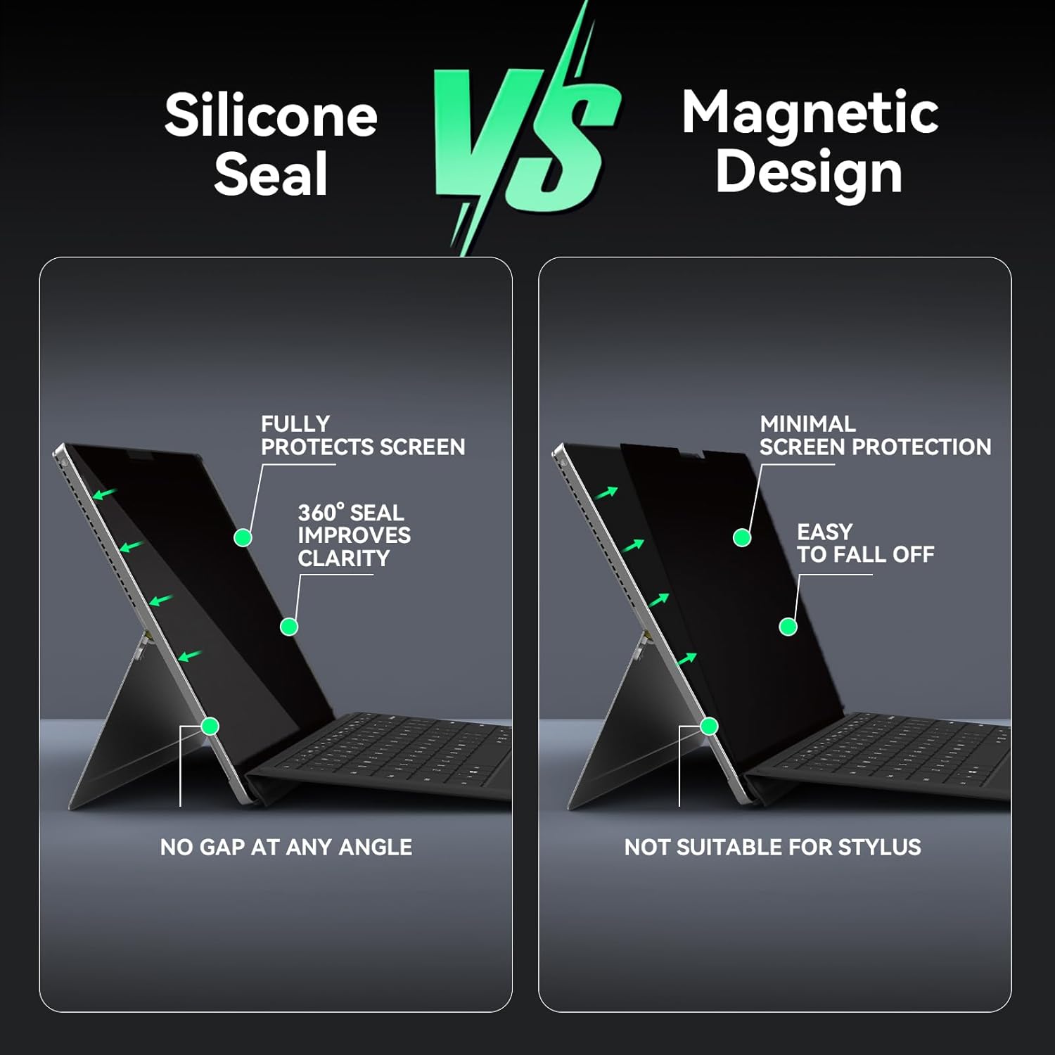 - 【Ugraded Design】- The ultra-thin Paper-like design maintains the device's true touch sensitivity and is compatible with stylus pens. Surface Pro 11/10/9/8/X-13 inch Privacy Screen Filter is reusable, updated with the Nanoglue strip at frame. It's never been so easy to install this privacy film just in seconds and it can be fully and tightly attached on the screen, easy On and Off, bubble free.