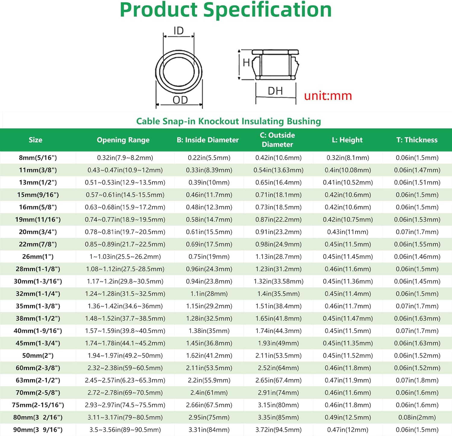 - GREAT FUNCTION: Our knockout insulating bushing converts raw edged knockout holes to smooth, neat, insulated holes and absorbs vibration and cushions; Our cable hose bushing grommet can also fix cables and prevent abrasion or scratches to improve safety