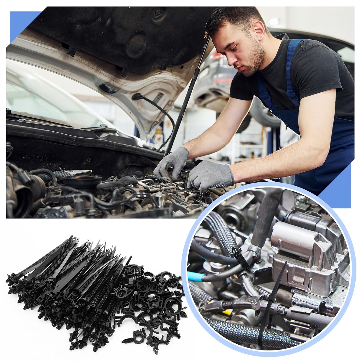 - Package Includes: A comprehensive 150-piece wire loom routing clip kit for automotive wiring. The set includes 30 pieces of 5 different types of wire harness clips, 60 pieces of 4 types of nylon cable ties, and 60 pieces of general-purpose cable ties. All neatly organized in a transparent, compartmentalized box for easy access and safe storage