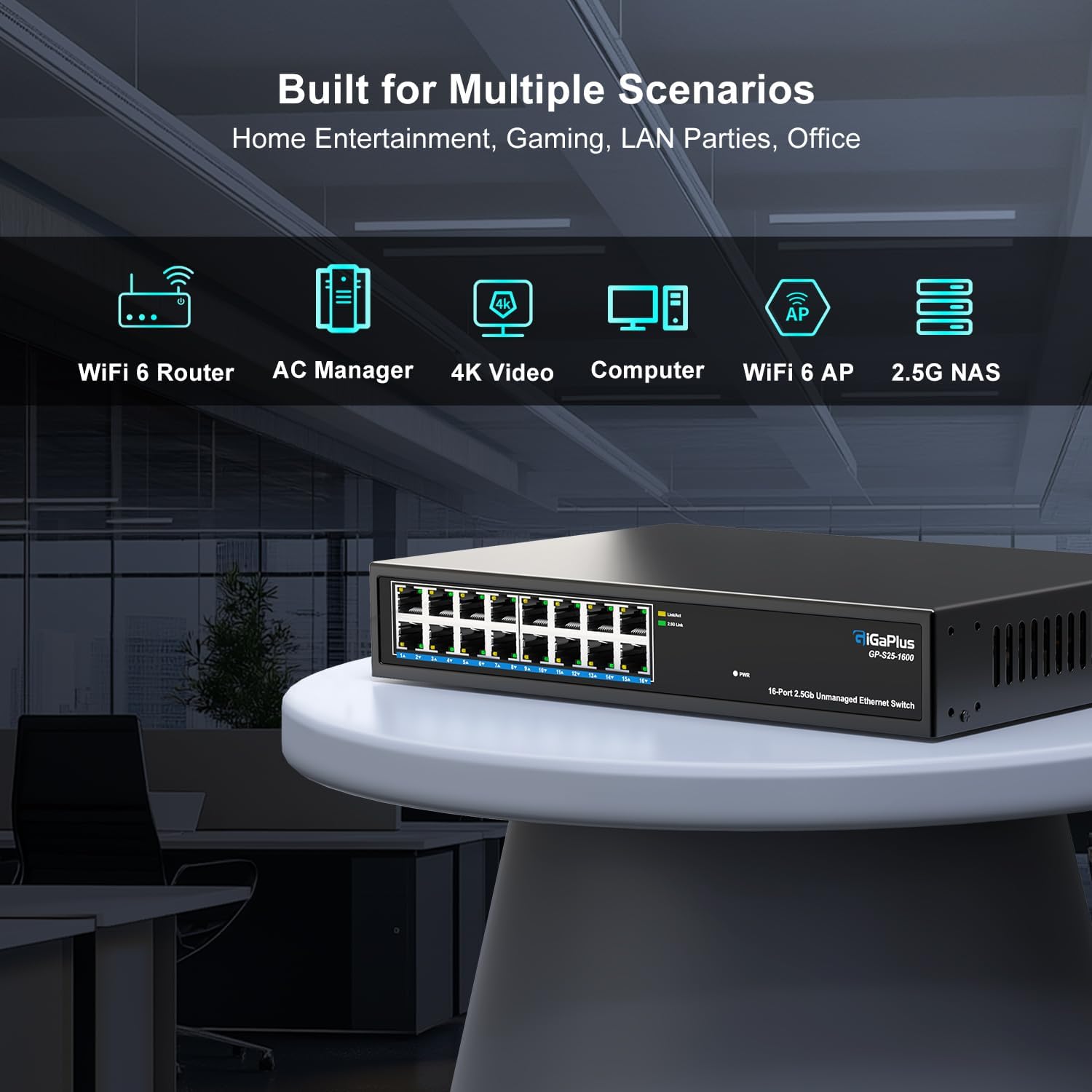 16 Ports 2.5Gb Unmanaged Ethernet Switch, 16*2.5G Base-T Ports. GiGaPlus 2.5Gbps Network Switch for 2.5Gbps NAS/PC, Wireless AP, WiFi6 Router. Plug and Play, Fanless Design.