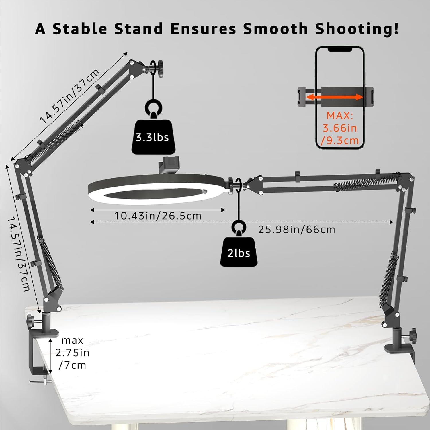 - ROBUST CLAMP and BROAD COMPATIBILITY : Desk clamp opens to 70 mm (2.75") with anti-slip foam + silicone pads to protect surfaces; quick to reposition between home office, studio, dorm, or workshop. Phone holder fits 2.4–3.93" width (iPhone 15 Pro Max, Galaxy S24 Ultra, Pixel 8a, etc.). 1/4" screw mount supports cameras, action cams, mini LEDs, or mics up to 2 lb (0.9 kg)—great for tabletop overheads, stop-motion, recipe reels, craft detailing, and macro product shots