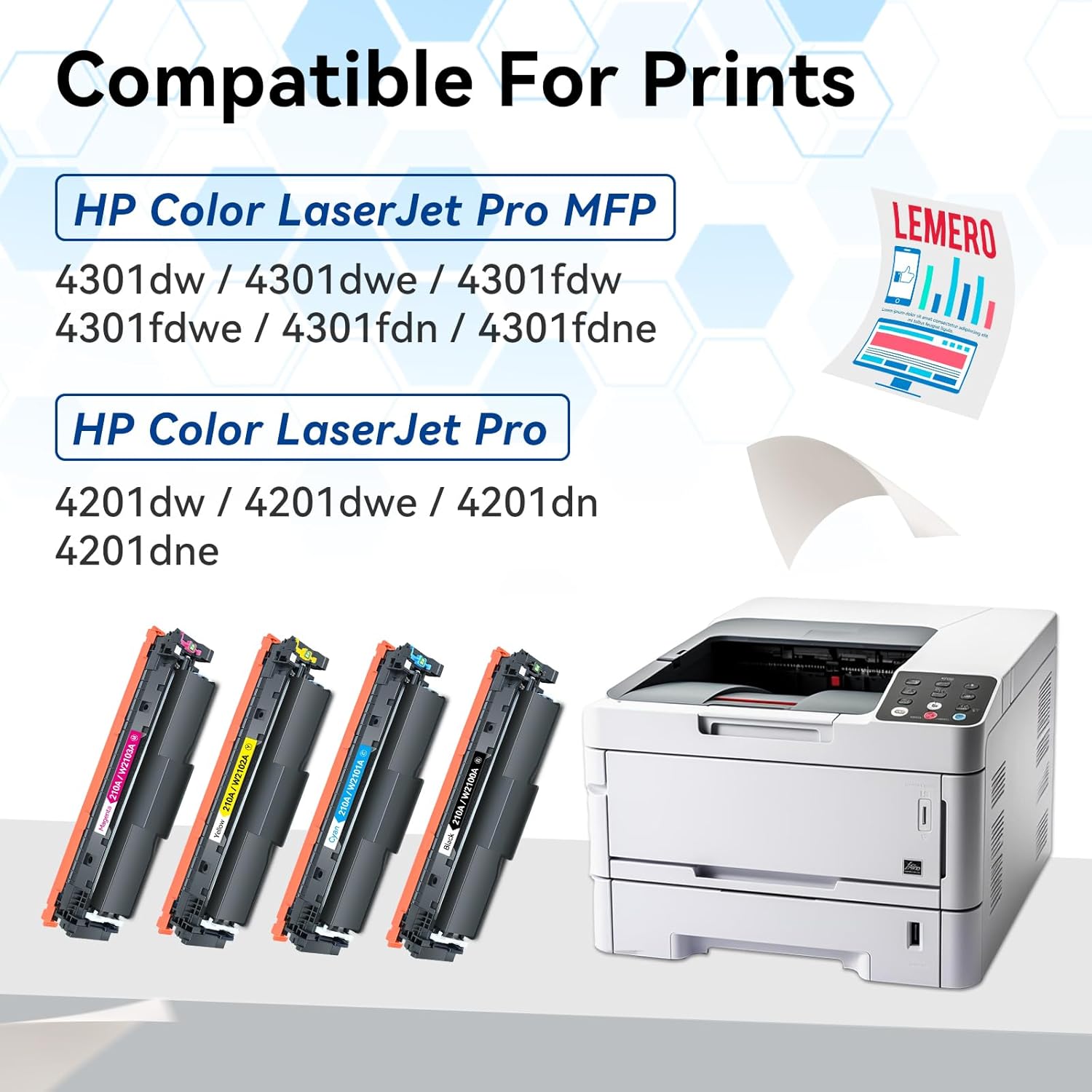- Advantage: LEMERO 210A toner cartridge set Compatible for HP 210A toner cartridges set HP 210X work with HP Pro MFP 4301dw 4301fdw 4301fdn toner cartridges printer, print true-to-life photos, resists fading and smudging