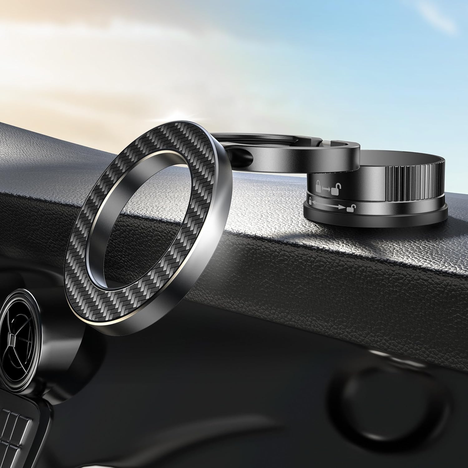 - ENHANCED TWIST LOCK VACUUM SUCTION CUP WITH WASHABLE GEL - The four-layer nano gel suction cup forms a powerful vacuum seal on dashboards or windshields—no extra adhesive pad needed. Just rinse with water to restore its stickiness for repeated use. Designed to stay secure even on flat but textured surfaces like vinyl dashboards, leather surfaces, carbon fiber trim, matte plastic, or woodgrain panels, this suction cup phone mount delivers rock-solid stability—no wobbling or detachment, even on bumpy roads.