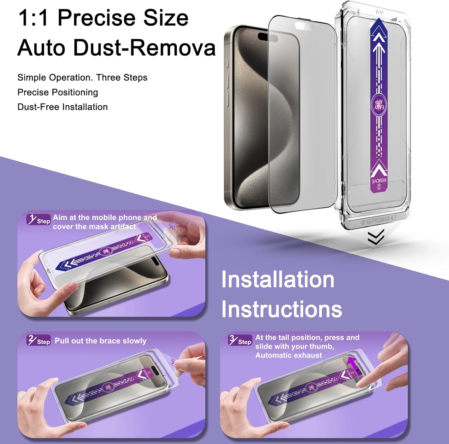 - Auto Dust Removal & Easy Alignment: This iPhone 15 Pro Max screen protector is designed with advanced auto dust removal and self-aligning technology to ensure a flawless,bubble-free installation every time. Simply place the alignment frame on your phone,pull the tab gently,then press and slide to push out any remaining air. The process is quick and hassle-free. For the best results,we recommend watching our step-by-step installation video before getting started