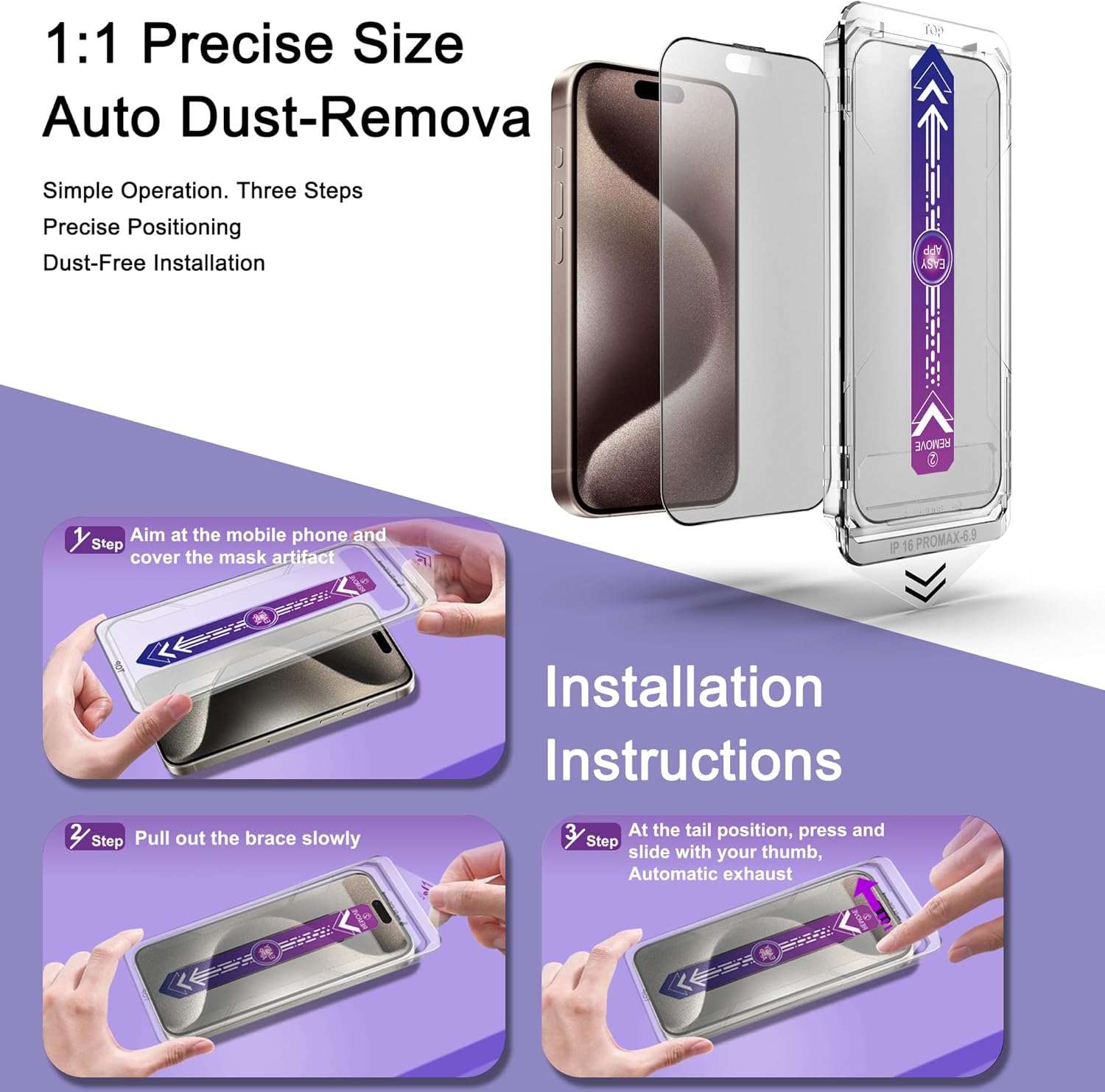 - Auto Dust Removal & Easy Alignment: This iPhone 16 Pro Max screen protector is designed with advanced auto dust removal and self-aligning technology to ensure a flawless,bubble-free installation every time. Simply place the alignment frame on your phone,pull the tab gently,then press and slide to push out any remaining air. The process is quick and hassle-free. For the best results,we recommend watching our step-by-step installation video before getting started