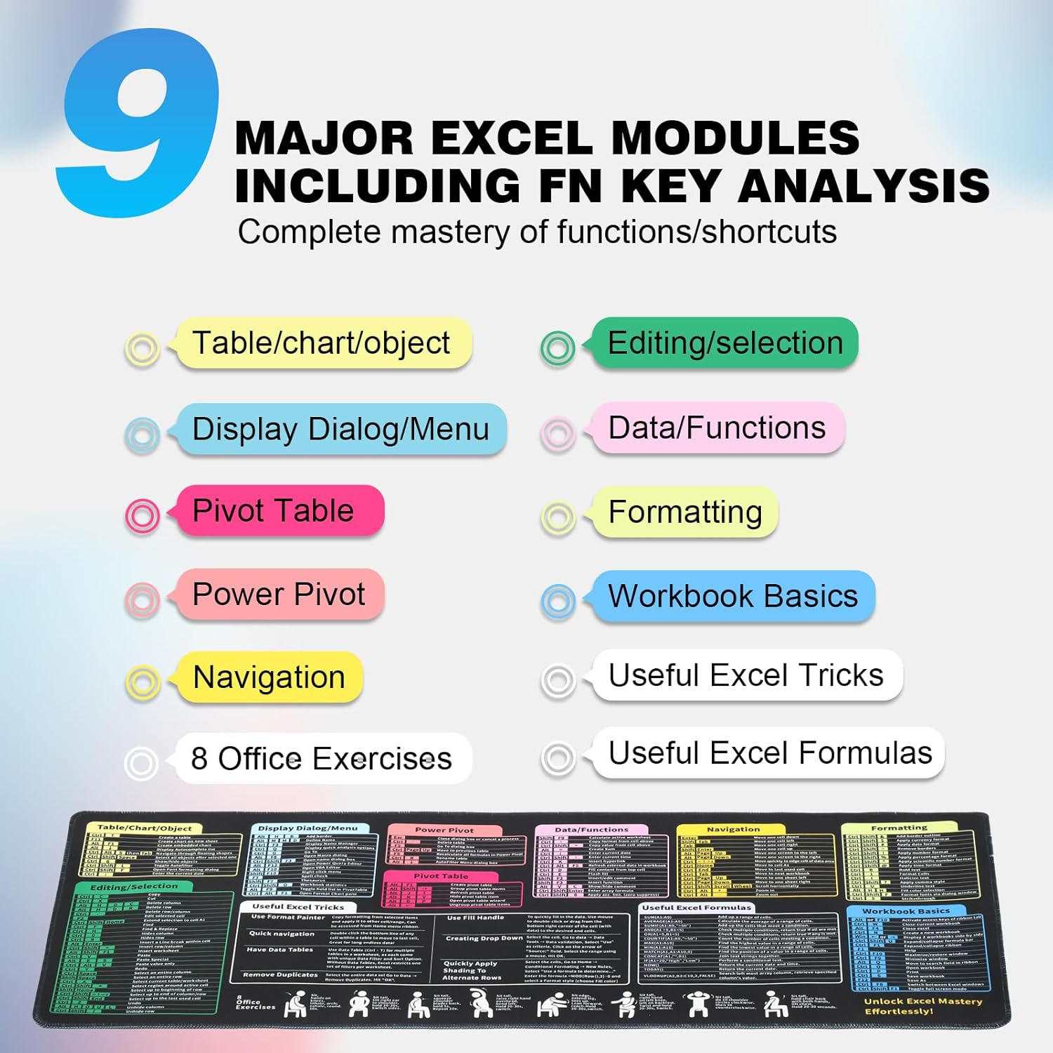 - EXCEL SHORTCUT GUIDE TO BOOST EFFICIENCY: Common Excel shortcuts are clearly printed on the mousepad. Beginners can get started quickly without memorizing complicated key combinations, while seasoned users can speed up their operations, stay focused, and greatly improve spreadsheet processing efficiency.