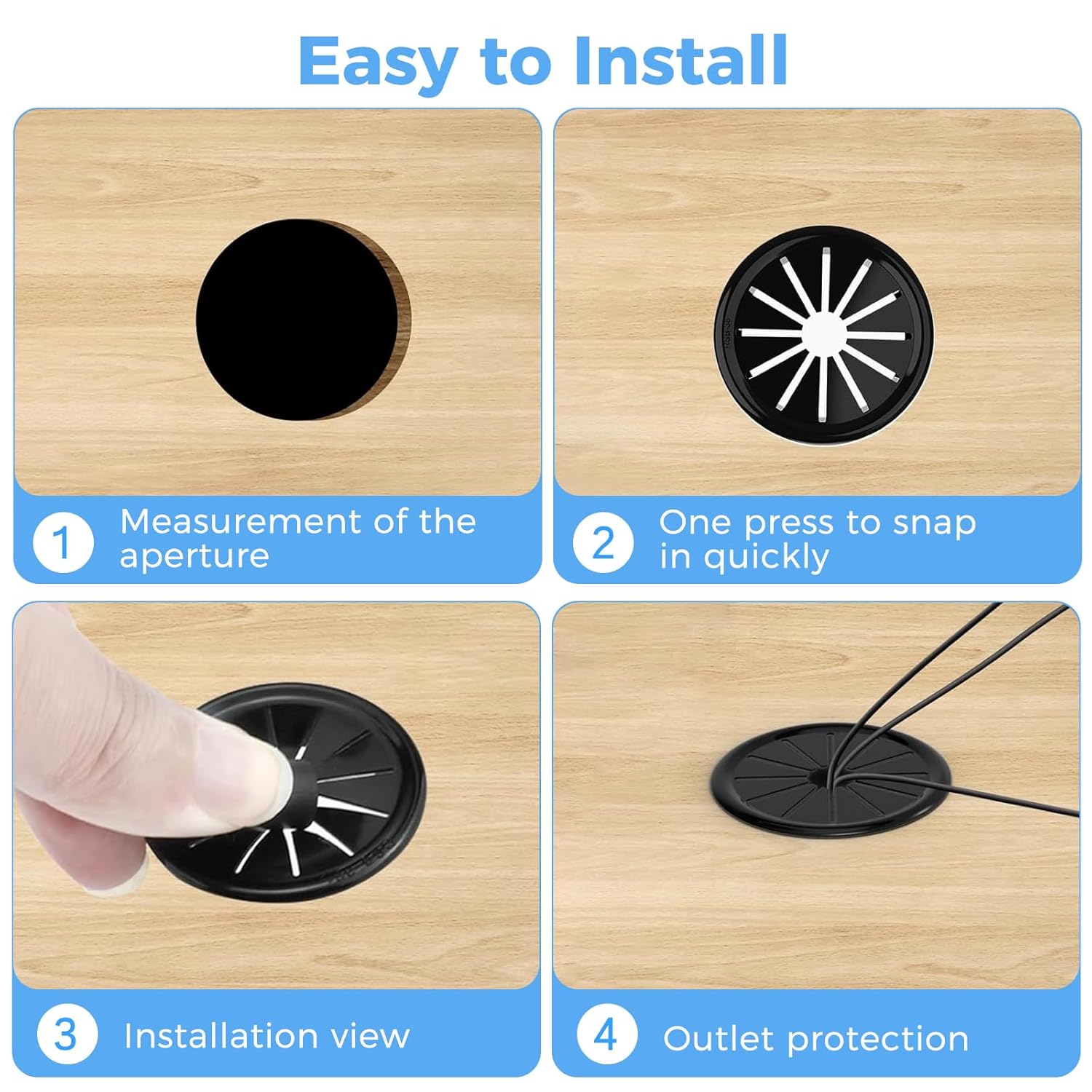 - Wide Applications: The desk wire hole insert is not only limited to computer countertops, computer components, office desks, office equipment; Snaps into electrical outlet box, switch box metallic box or other enclosure; Our hole bushing provide insulation and mechanical protection for electrical and telecommunication cables in most residential, industrial, automotive equipment and machinery