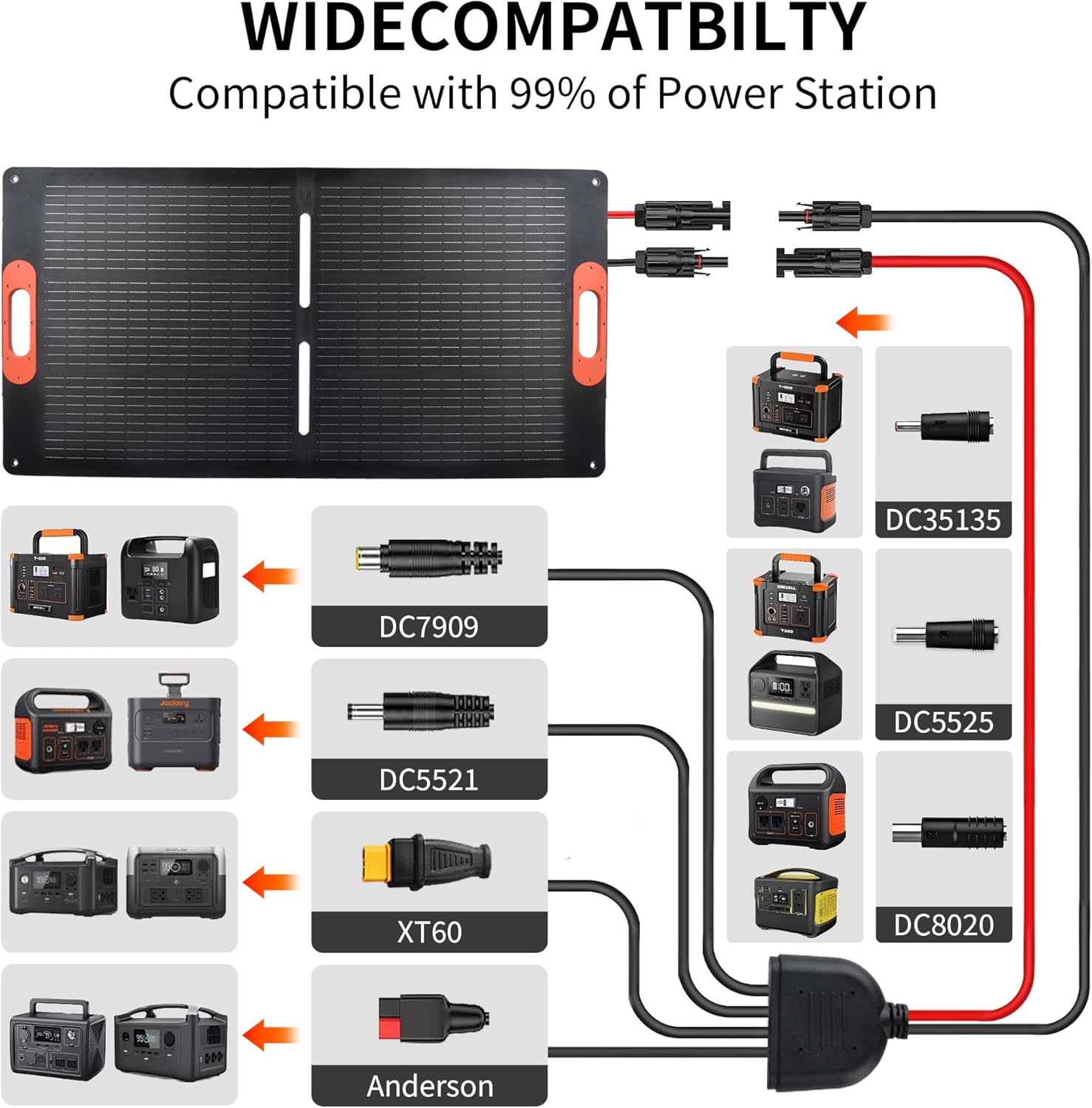 - 【Compatible with most solar generators】The 100w solar panel is equipped with 1 x MC4-to-XT60 Anderson DC5521 DC7909, 1 x 3-in-1 DC connector (DC8020/5525/35135), and is compatible with 99% of portable power stations on the market. Anderson&XT60 works with ECOFLOW (DELTA & RIVER SE), Anker SOLIX C1000, BLUETTI (AC200P/AC200MAX/EB150/EB240), and Jackery Explorer (1000/1500/2000 Pro); DC35135 fits MARBERO 80W/100W/200W; DC5521 works for MARBERO 300W and FlashFish 200W/300W; DC7909 is for Jackery Explorer (160/240/300/500/1000). DC8020 works for ECOFLOW exclusive (Delta/River series only).