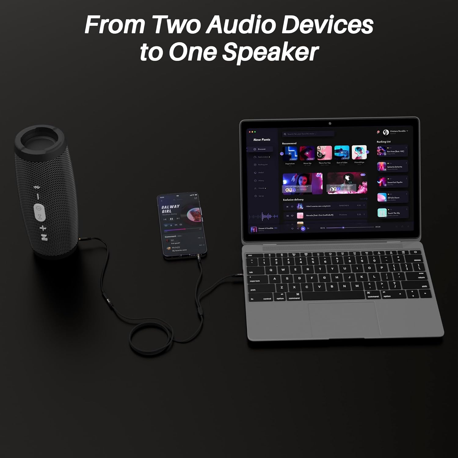 - 【TRS Splitter Audio Cable】:This 1/8inch splitter cable connects 2 separate audio play devices to headphone or speaker, seamlessly switching between two audio sources to one speaker without frequent cable replacement to avoid frequent plugging and unplugging. Note: due to the close distance between the two male plugs (approximately 1FT), it is not recommended to insert both headphones at the same time.
