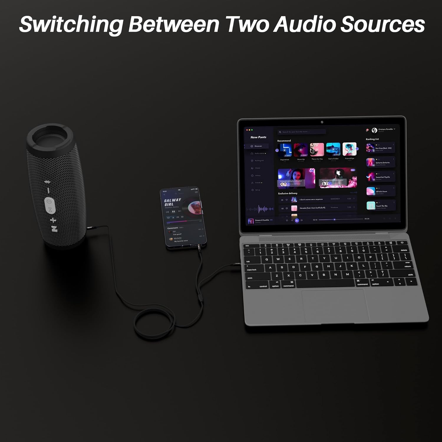 - 【TRS Splitter Audio Cable】:This 1/8inch splitter cable connects 2 separate audio play devices to headphone or speaker, seamlessly switching between two audio sources to one speaker without frequent cable replacement to avoid frequent plugging and unplugging. Note: due to the close distance between the two male plugs (approximately 1FT), it is not recommended to insert both headphones at the same time.