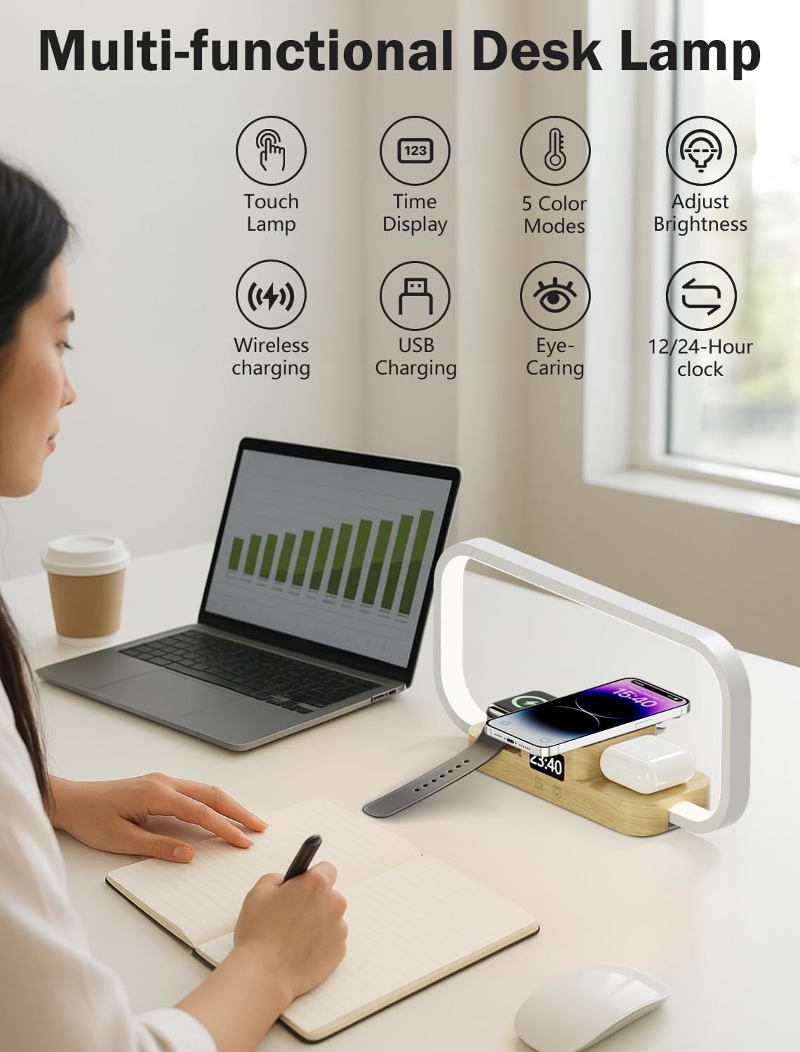 LED Bedside Lamp with Wireless Charger, 3 in 1 Touch Control Bedside Lamp, 5 Color Mode & Dimmable, Desk Lamps with Clock for Nightstand, Table Night Lamp for Bedroom, Gifts for Women, Men, Friends