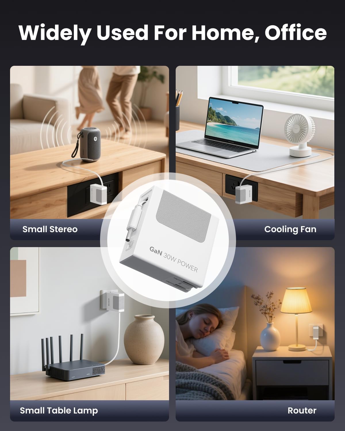 - Retractable 31.5in DC Power Cord: The wall charger features a built-in retractable DC power cord that extends to a length of 31.5 inches and adjusts in 10 levels to meet different length requirements. Its built-in retractable mechanism allows the cable to retract freely in one second, ensuring a tidy space at home, in the office, or while traveling. Note: After pulling out the cable, gently stretch it another 1 cm to retract it.