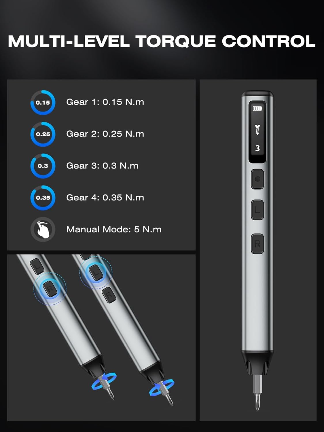 - PRECISION DUAL-MODE POWER: Equipped with a high-speed motor, it delivers multi-level adjustable torque (0.15-0.35 N.m across 4 gears), plus a powerful 5 N.m manual mode. This enables fine-tuned force for delicate electronics, ensuring optimal tightening and preventing damage, ideal for intricate repair tasks.