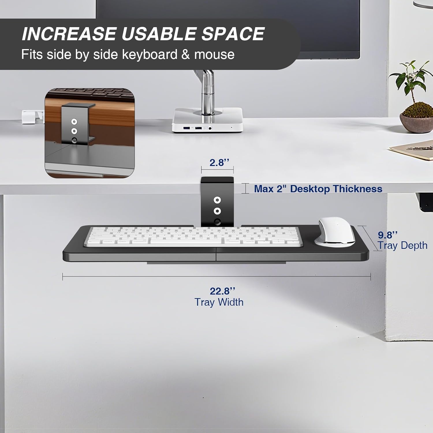 - Easy Installation: All necessary hardware and instructions are provided for assembly. Please install and use this product according to the instructions. Please confirm your table before buying (2” Maximum Desk Thickness). The tray holds up to 11 lbs and provides enough room for small to standard-size keyboards. (If the screw holes of the tary and the connecting plate are incorrect, please check whether the tray's assembly direction is correct!)