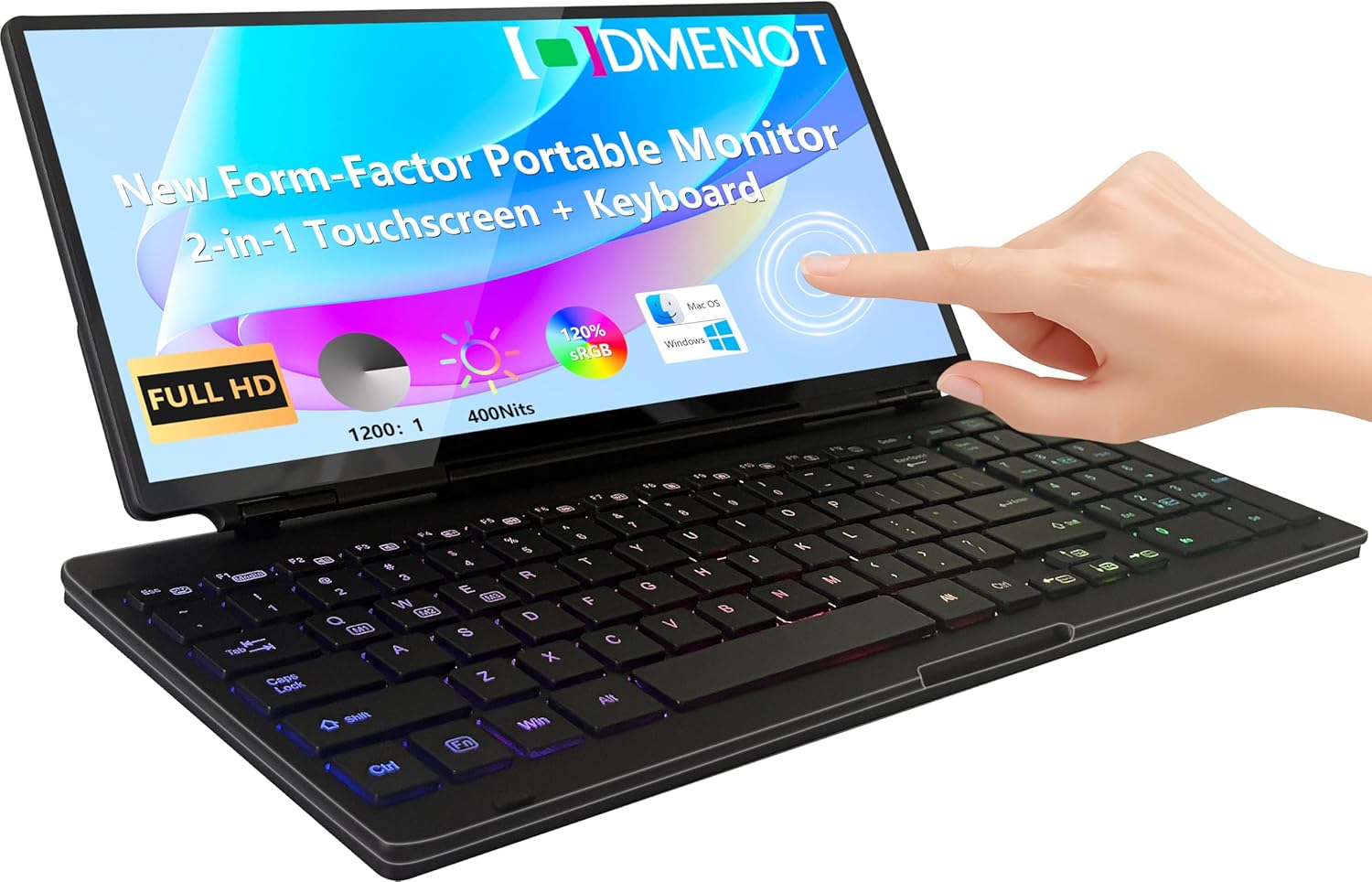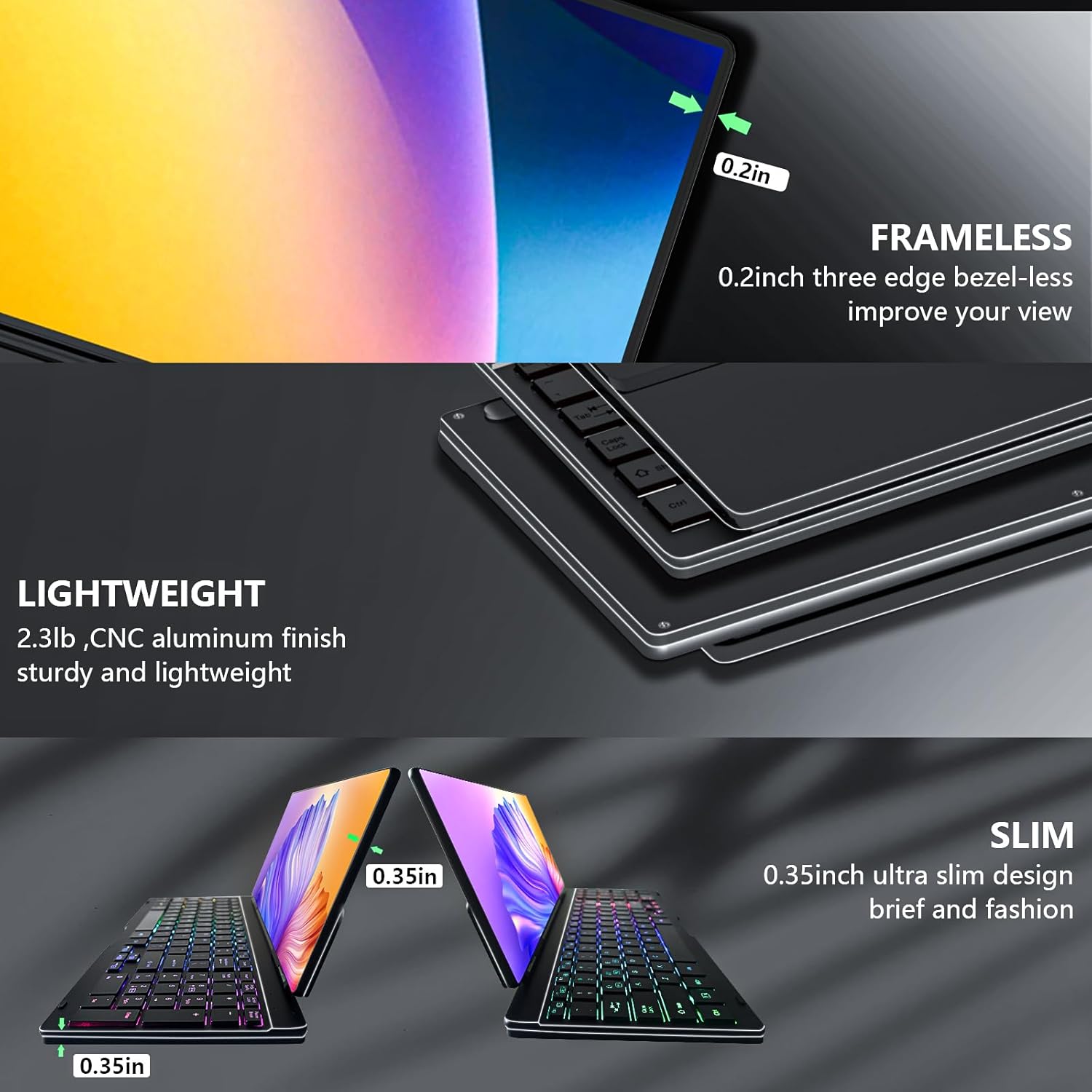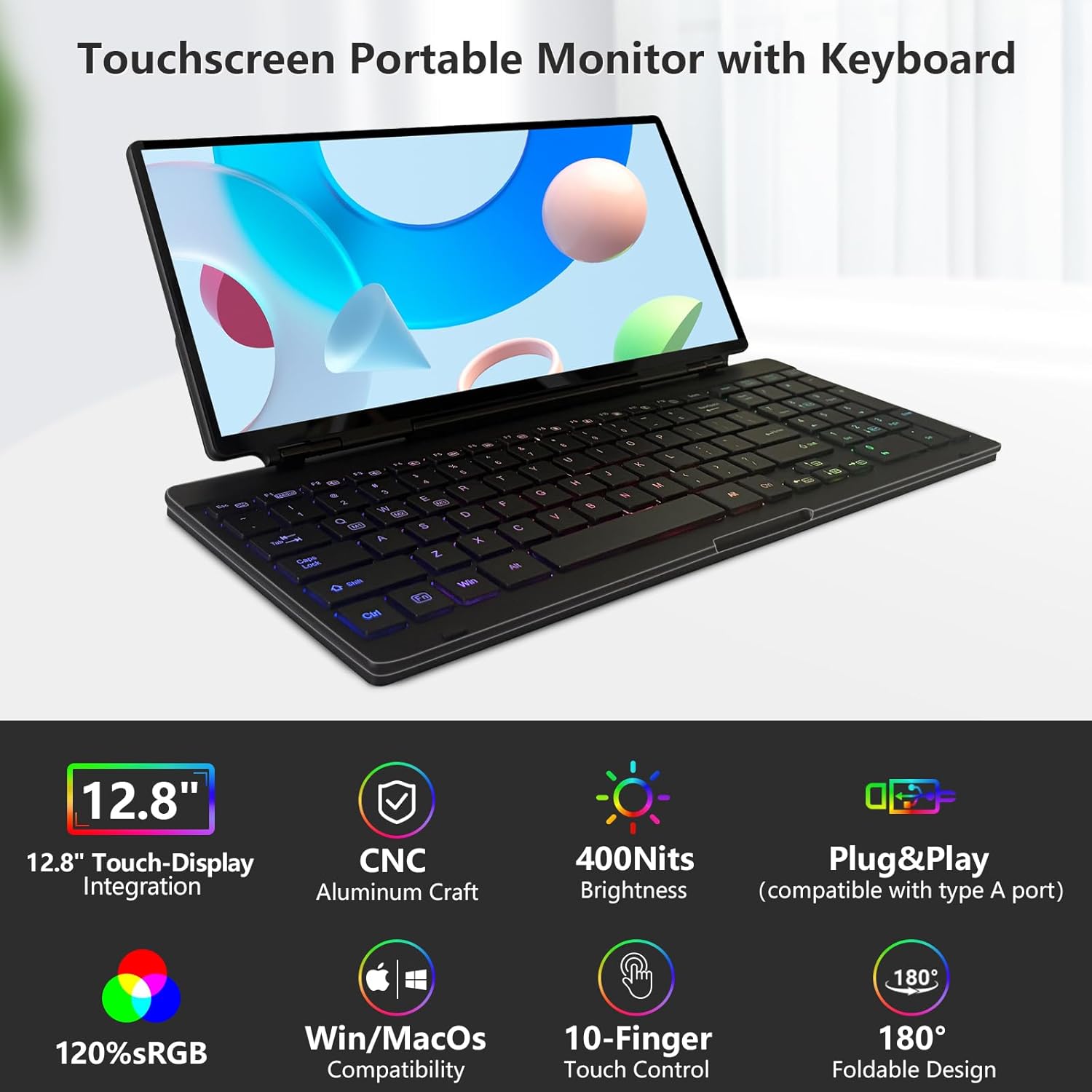 - 【Revolutionary 2-in-1 Innovative Design】The 2025 Odmenot 12.8-inch ultra-thin foldable keyboard monitor breaks the boundaries of traditional keyboards with its groundbreaking 2-in-1 design, combining a physical keyboard and a 10-point touchscreen. This revolutionary input method delivers a multi-screen collaborative immersive experience. The adjustable touchscreen (0–180°) follows ergonomic principles, ensuring comfort for work and entertainment.
